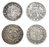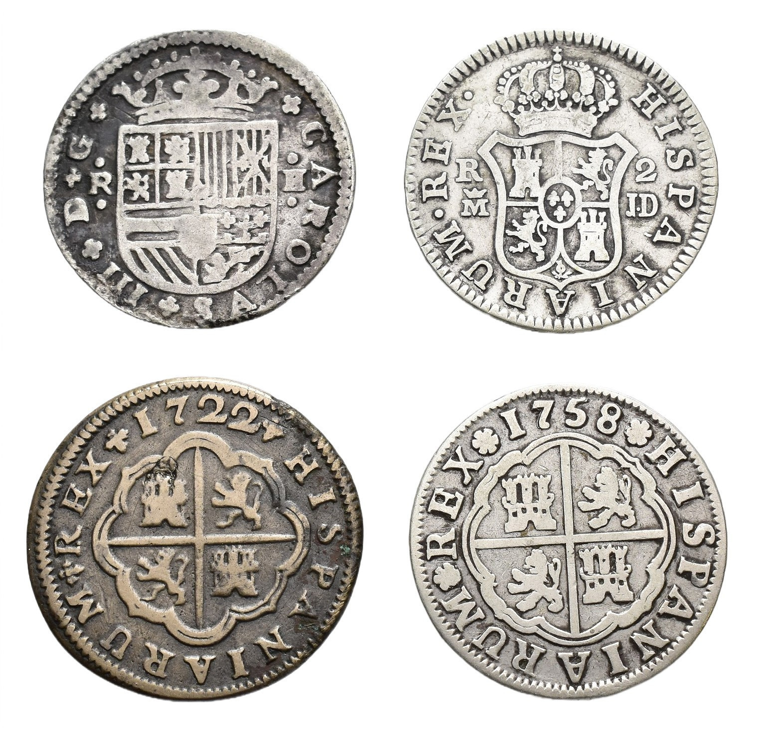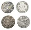 ARCHIDUQUE CARLOS. Lote 4 piezas de 2 reales: Archiduque Carlos Barcelona, s.F.; Felipe V Sevilla 1722; Fernando VI Sevilla 1758 y Carlos III Madrid 1783. BC+/MBC-.