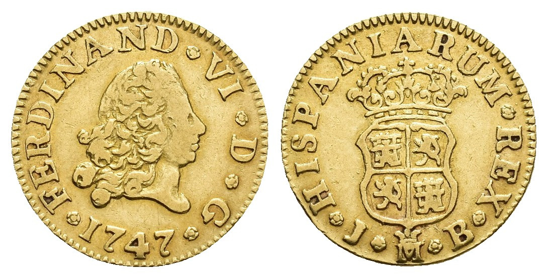 FERNANDO VI (1746-1759). Madrid. 1/2 escudo. 1747. JB. AU 1,75 g. 14,3 mm. Pequeñas marcas. VI-403; AC-548. MBC.