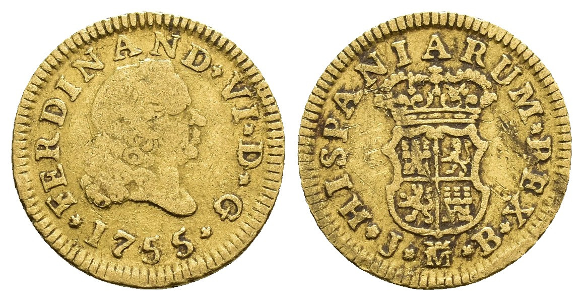 FERNANDO VI (1746-1759). Madrid. 1/2 escudo. 1755. JB. AU 1,74 g. 15,6 mm. VI-413; AC-558. Pequeñas marcas. BC+.