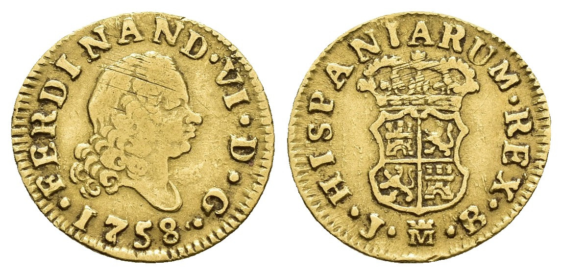 FERNANDO VI (1746-1759). Madrid. 1/2 escudo. 1758. JB. AU 1,72 g. 14,5 mm. VI-417; AC-564. Rayas de ajuste. MBC-.