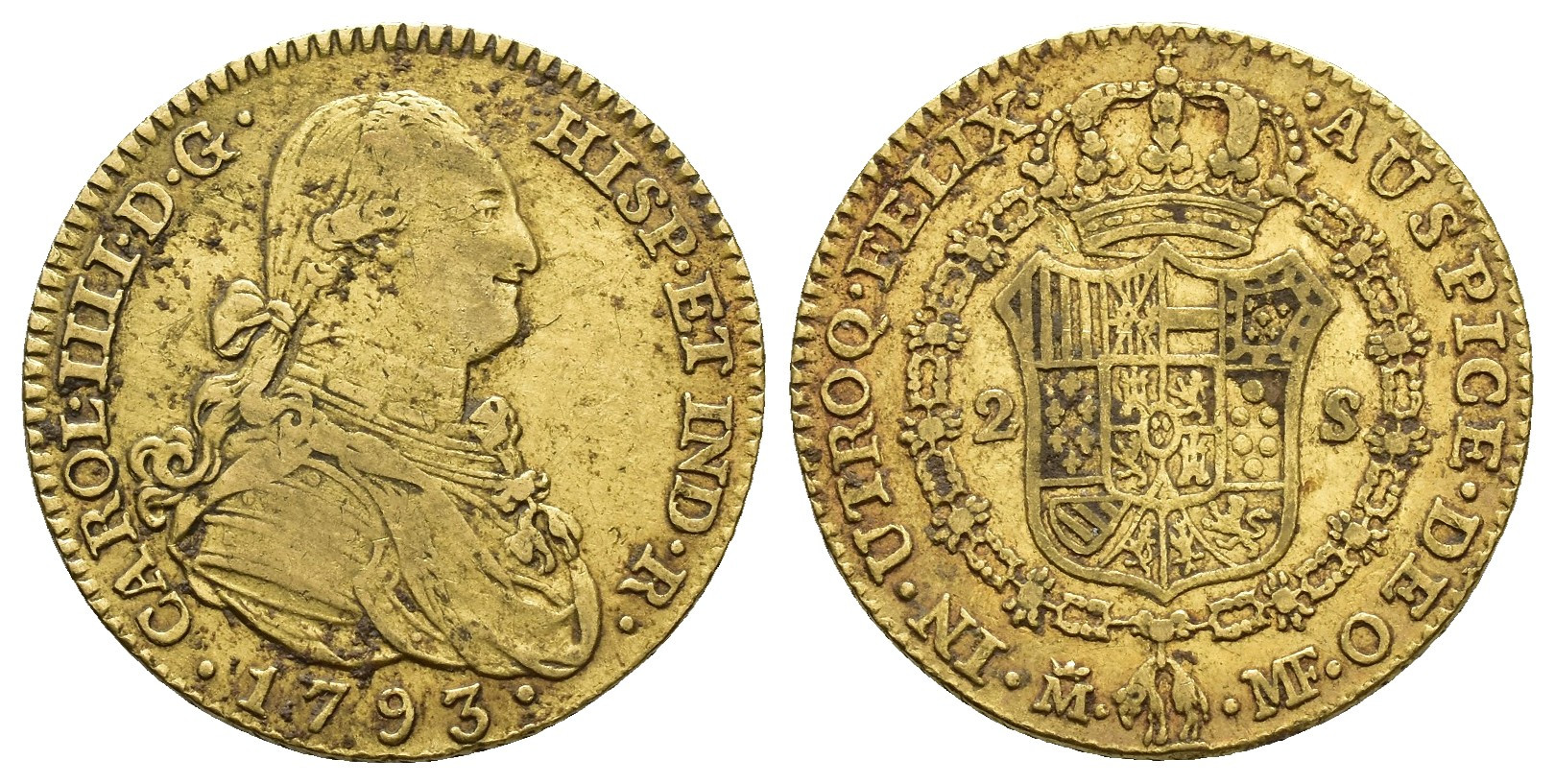 CARLOS IV (1788-1808). Madrid. 2 escudos. 1793. AU 6,75 g. 21,6 mm. VI-1041; AC-1279. MBC-.
