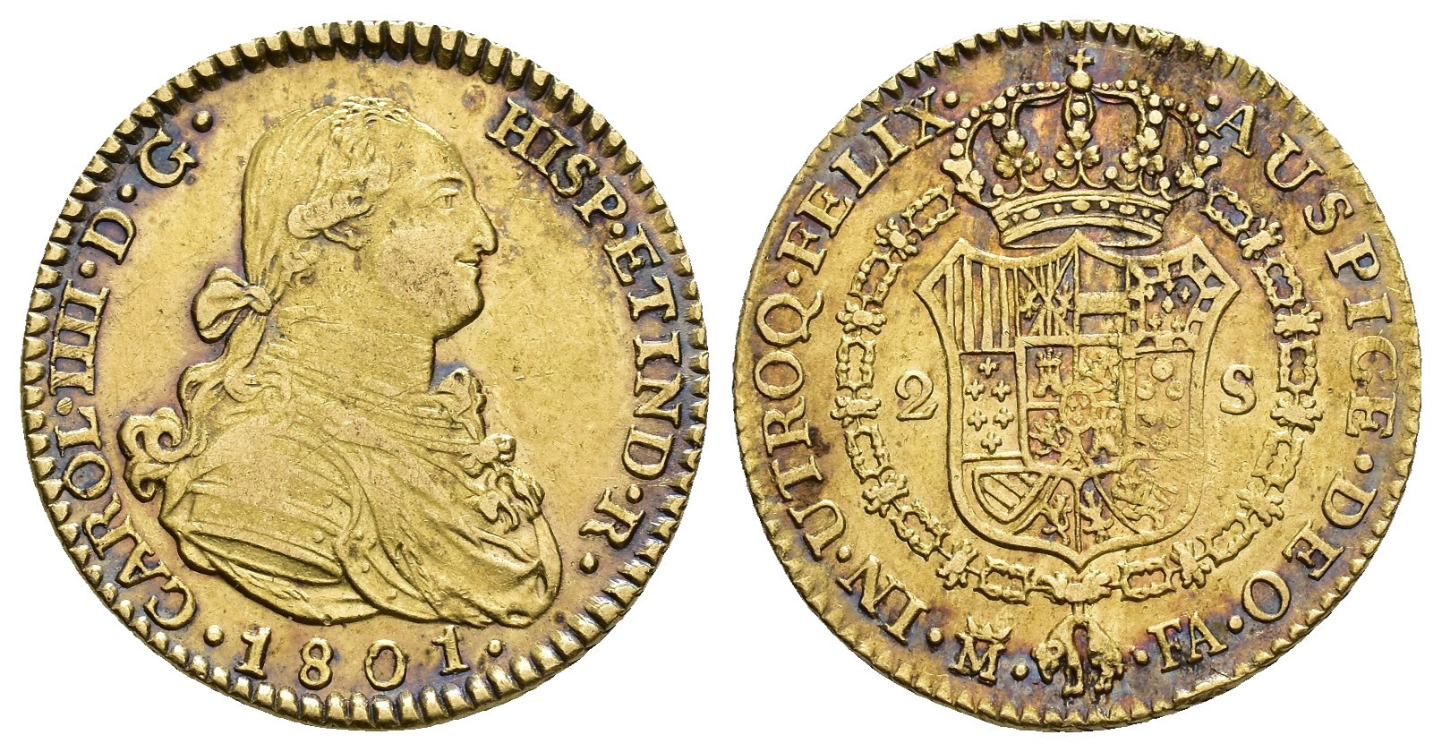 CARLOS IV (1788-1808). Madrid. 2 escudos. 1801. FA. AU 6,72 g. 22,3 mm. VI-1052; AC-1803. Ligera pátina. MBC.