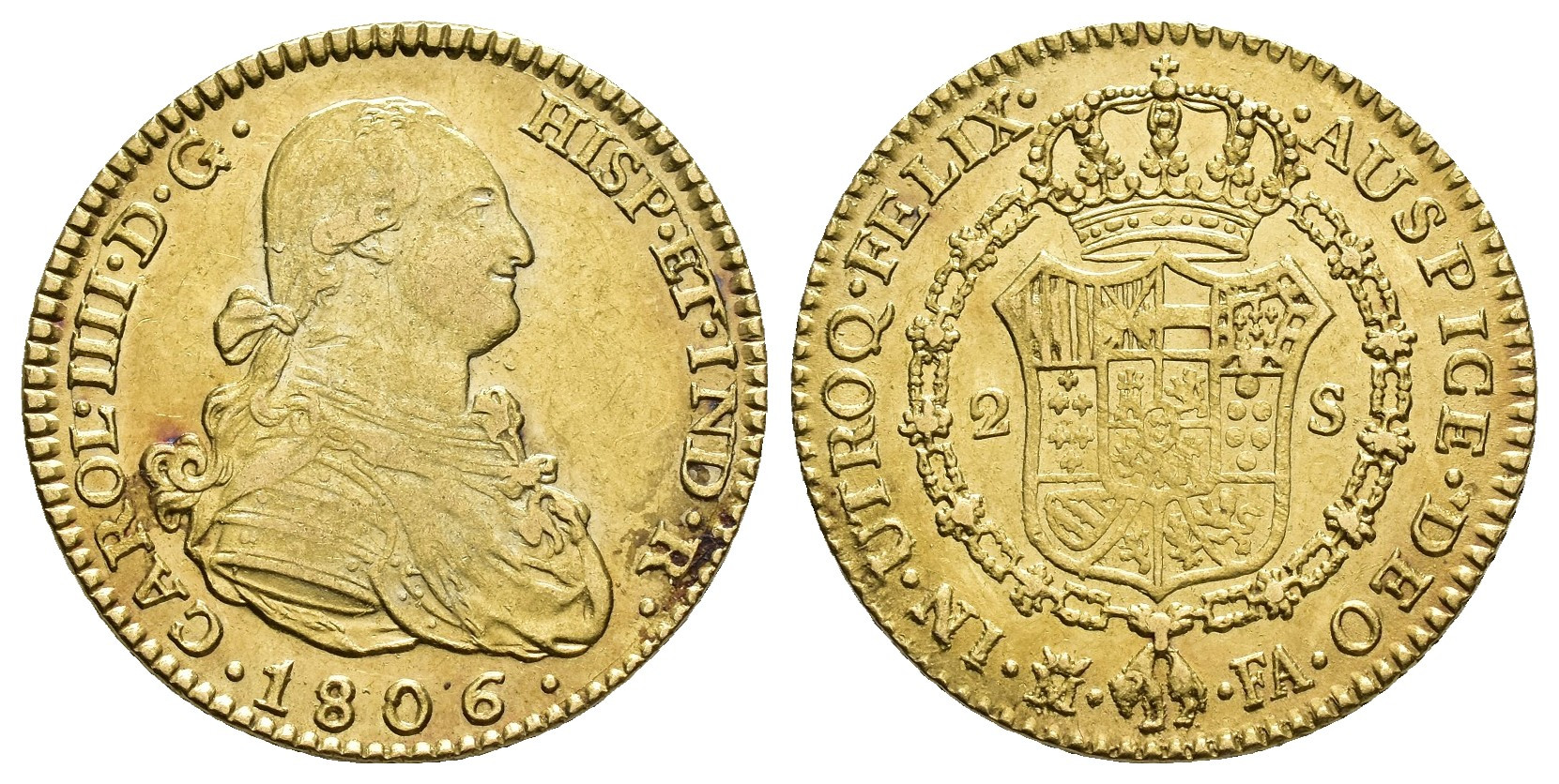 CARLOS IV (1788-1808). Madrid. 2 escudos. 1806. FA. AU 6,79 g. 22,2 mm. VI-1057; AC-1314. Rayitas de ajuste. MBC+.