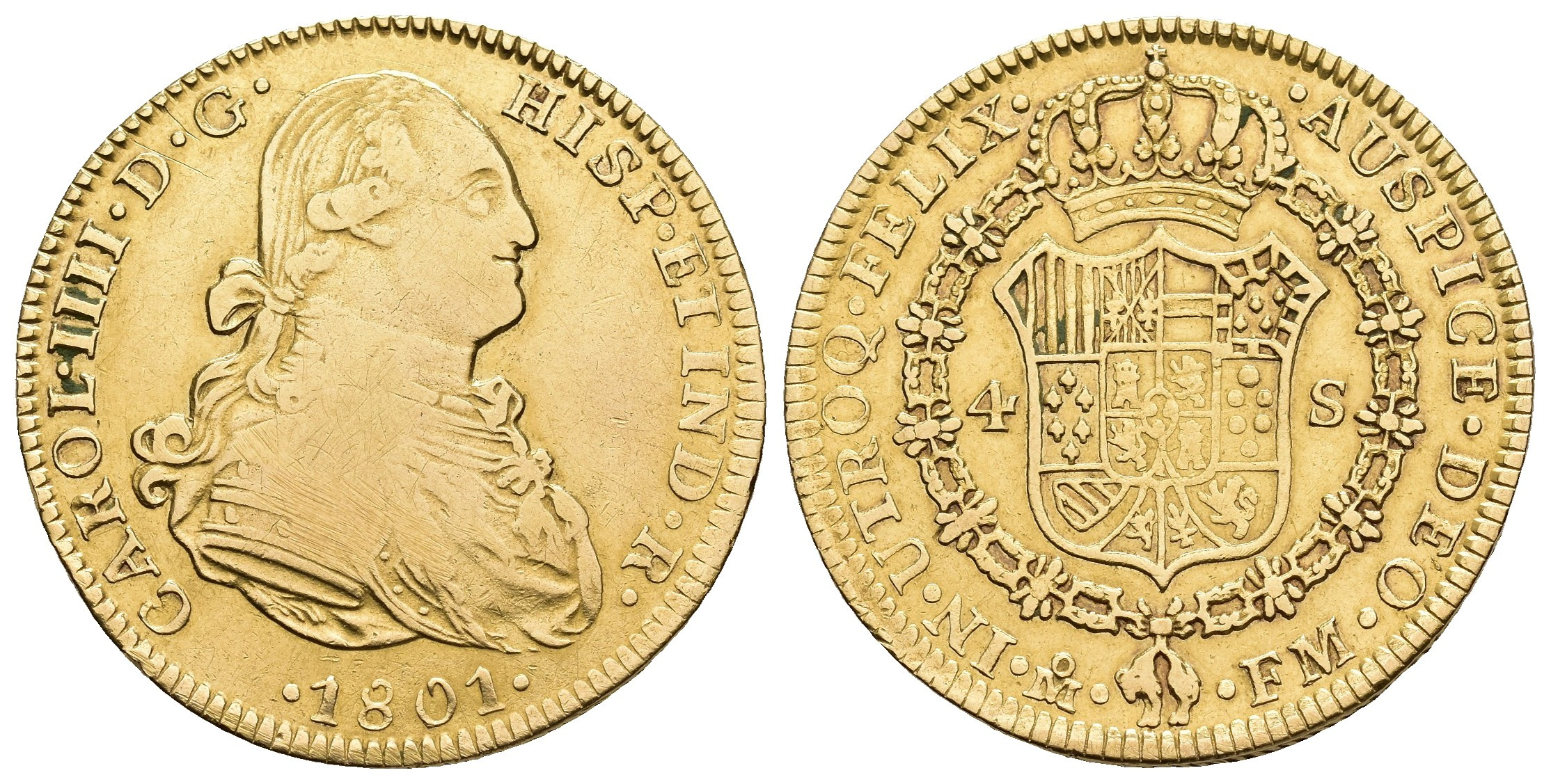 CARLOS IV (1788-1808). México. 4 escudos. 1801. FM. AU 13,46 g. 30,03 mm. VI-1215; AC-1497. Estuvo engarzada. MBC-/MBC.