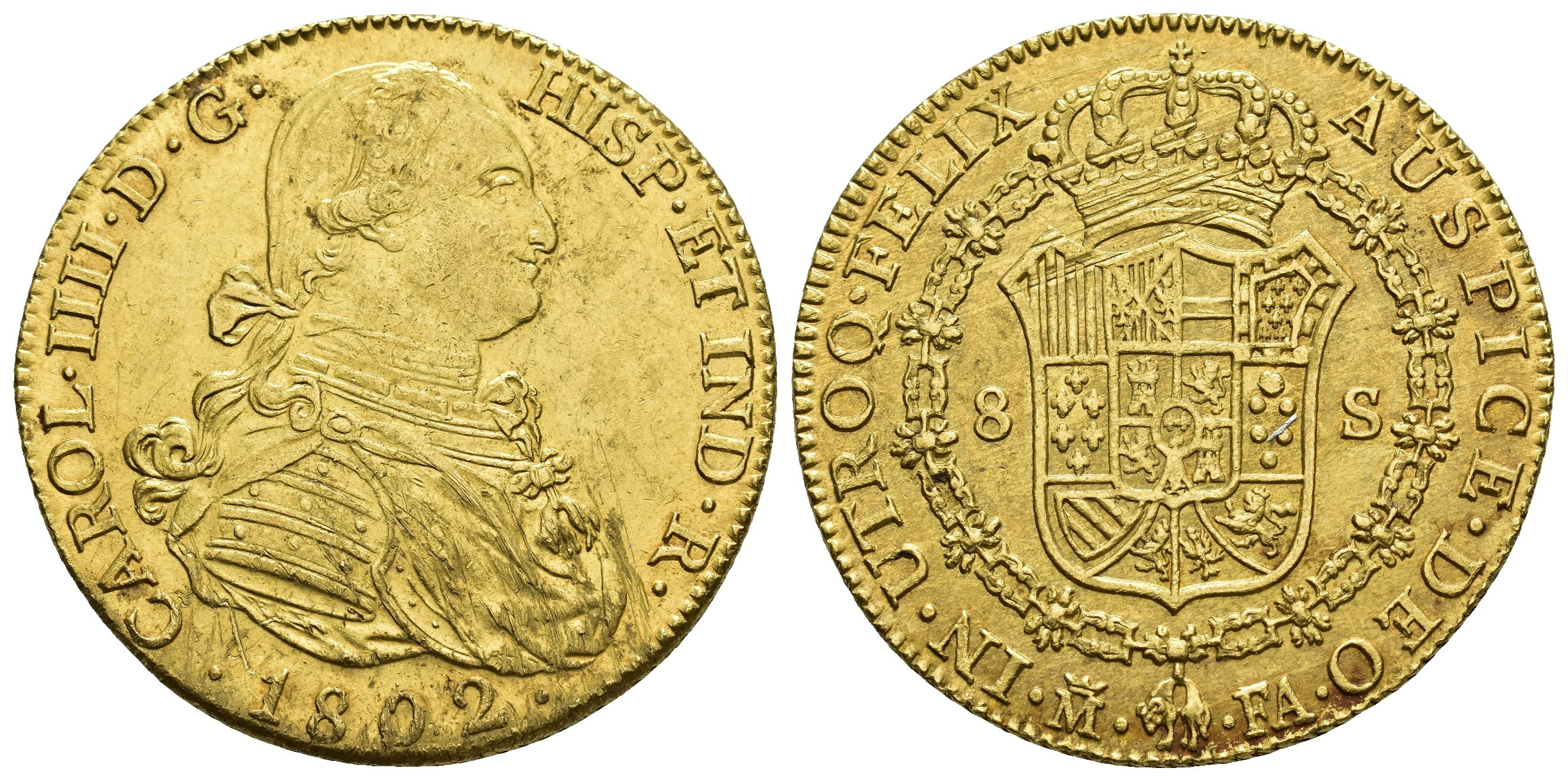 CARLOS IV (1788-1808). Madrid. 8 escudos. 1802. FA. AU 27,18 g. 35,7 mm. VI-1321; AC-1621. Rayas en anv. y rayas de ajuste en rev. EBC-.
