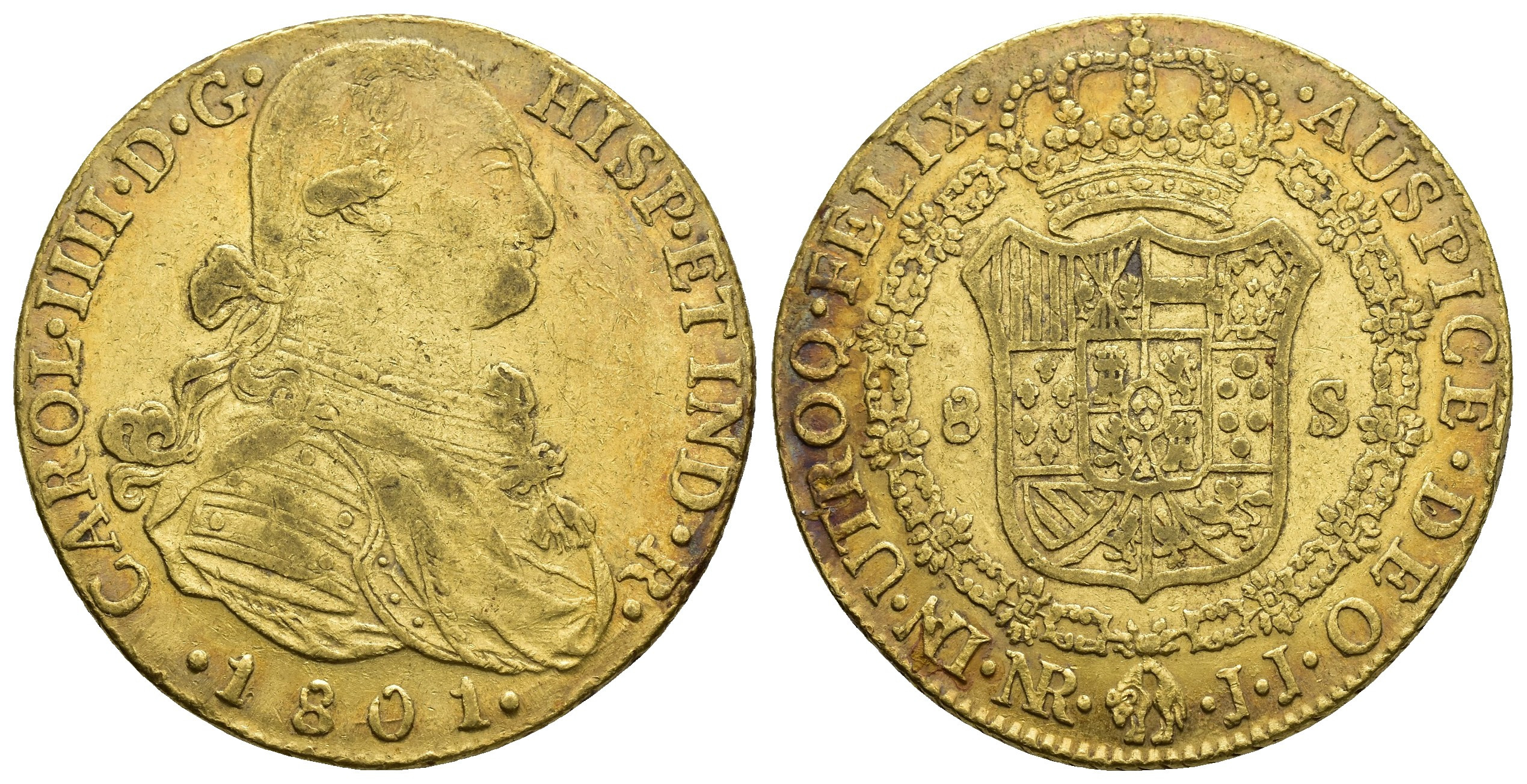 CARLOS IV (1788-1808). Nuevo Reino. 8 escudos. 1801. JJ. AU 26,86 g. 35,3 mm. VI-1359; AC-1738. Marquitas. BC+.