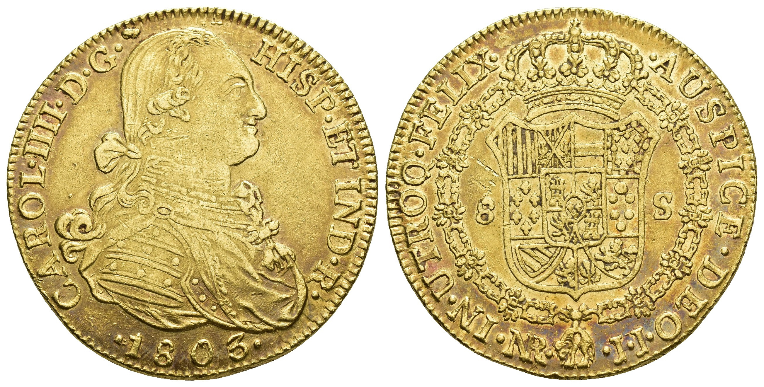 CARLOS IV (1788-1808). Nuevo Reino. 8 escudos. 1803. JJ. AU 26,86 g. 35,3 mm. VI-1361; AC-1742. Rayitas y pequeñas marcas. Ligera pátina. MBC.