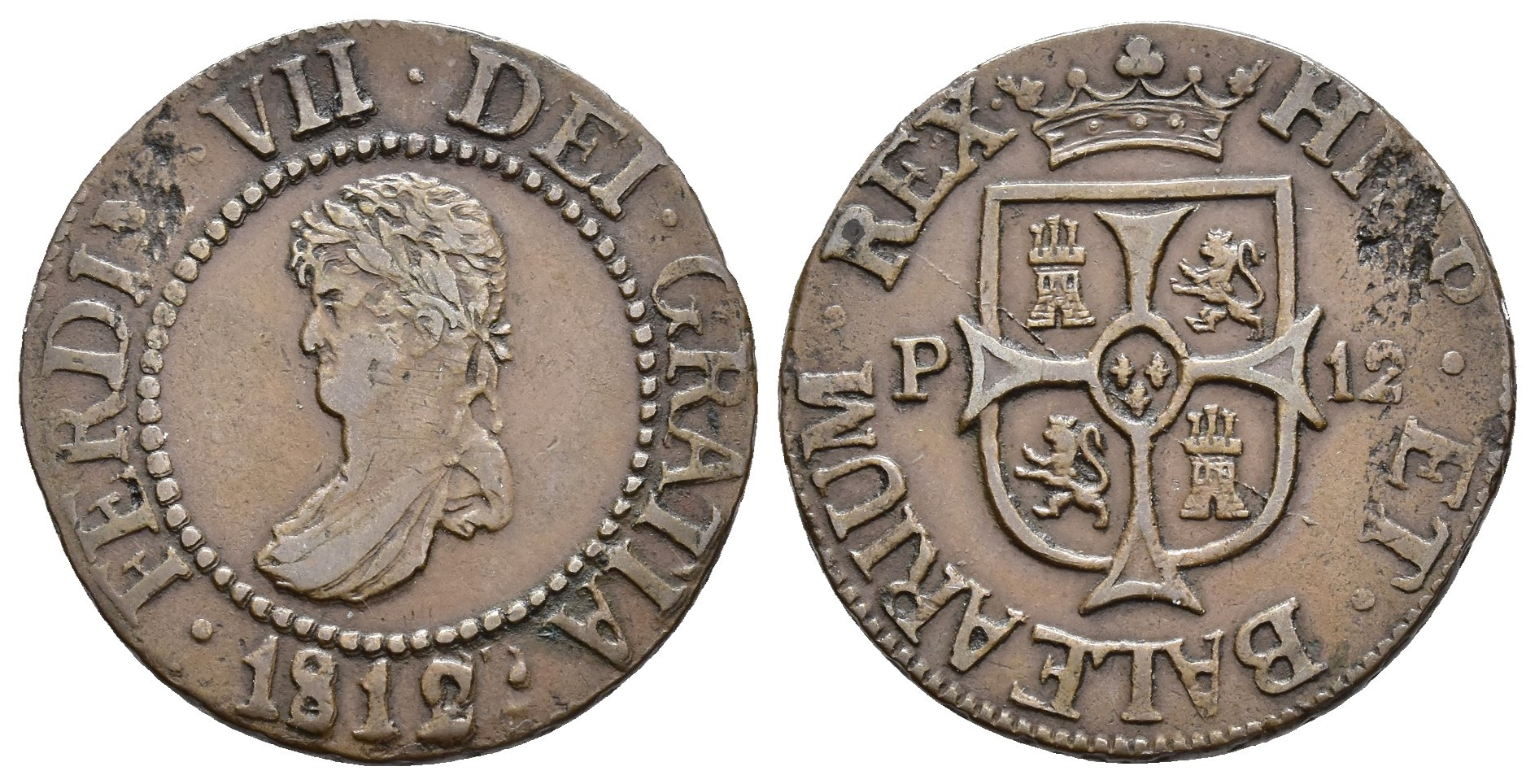 FERNANDO VII (1808-1833). Palma de Mallorca. 12 diners. 1812. CU 6,43 g. 25,6 mm. VI-87; AC-24. Rebaba por rotura de cuño. Defectos en el cuño. MBC/MBC+.