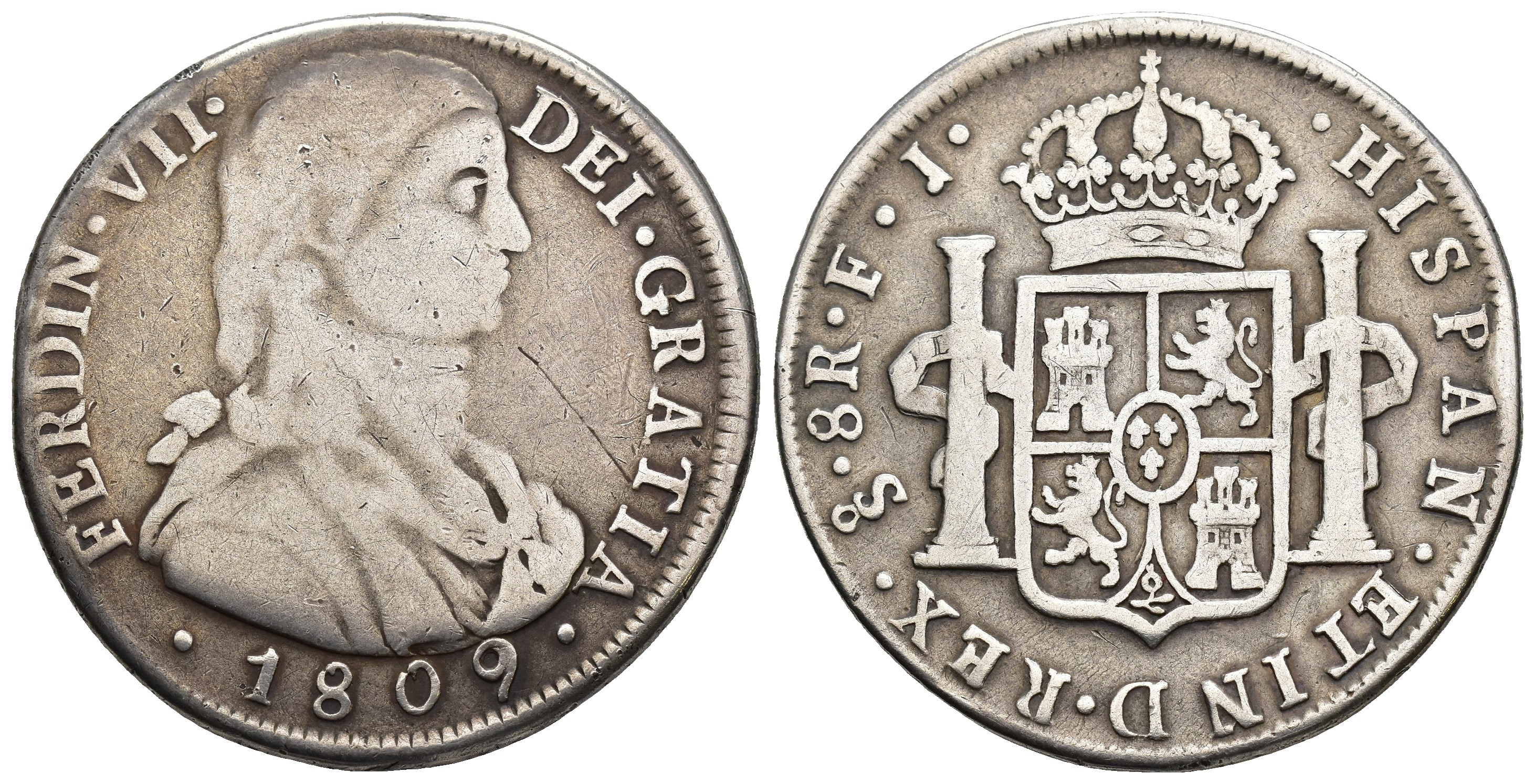 FERNANDO VII (1808-1833). Santiago. 8 reales. 1809. FJ. AR 25,35 g. 40,6 mm. VI-1152; AC-1400. Golpecito en canto. Rayita en anv. BC+. Rara.
