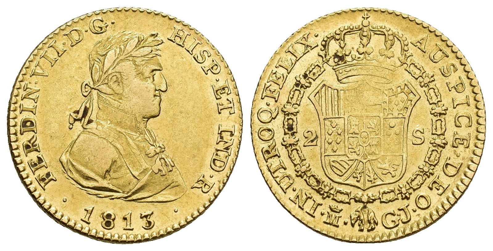FERNANDO VII (1808-1833). Madrid. 2 escudos. 1813. GJ. AU 6,72 g. 21,6 mm. VI-1335; AC-1610. Rayitas. Leve vano en rev. Ligeramente abrillantada. MBC/MBC+. Muy escasa.