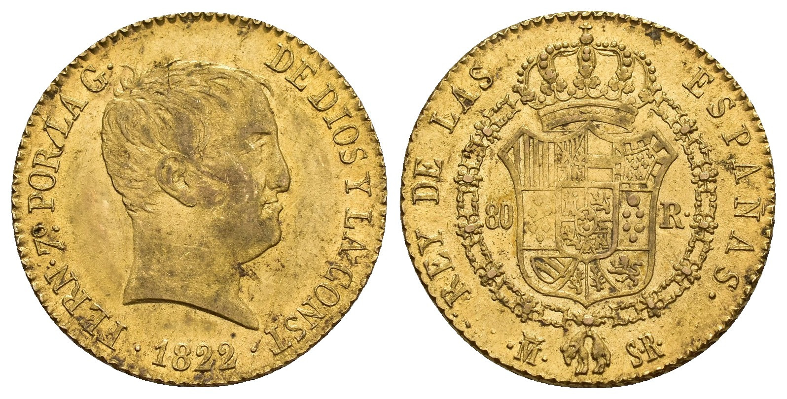 FERNANDO VII (1808-1833). 80 reales. 1822. AU 6,75 g. 21,4 mm. VI-1344; AC-1641. Hojita sin saltar en anv. MBC.