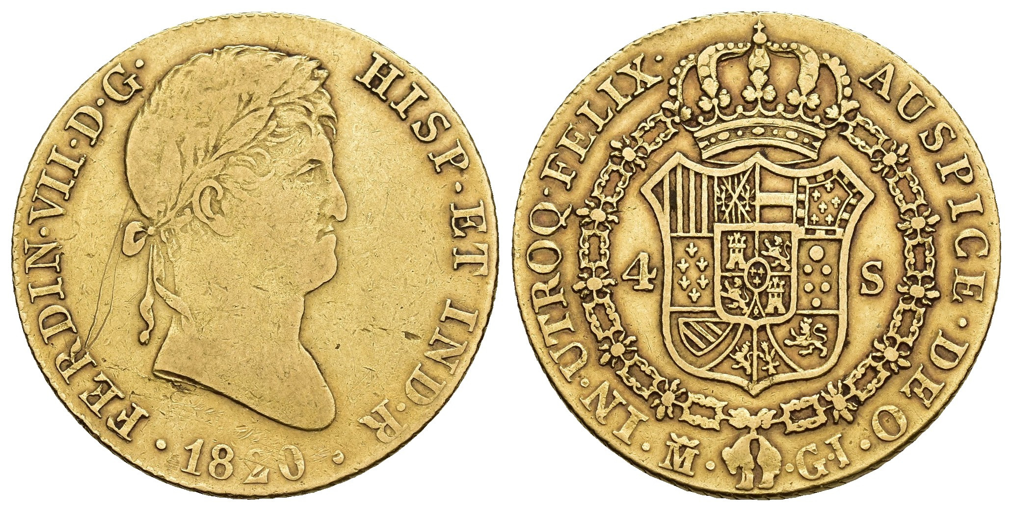 FERNANDO VII (1808-1833). Madrid. 4 escudos. 1820. GJ. AU 13,47 g. 27,8 mm. VI-1425; AC-1716. Rayita en rev. BC+/MBC-.