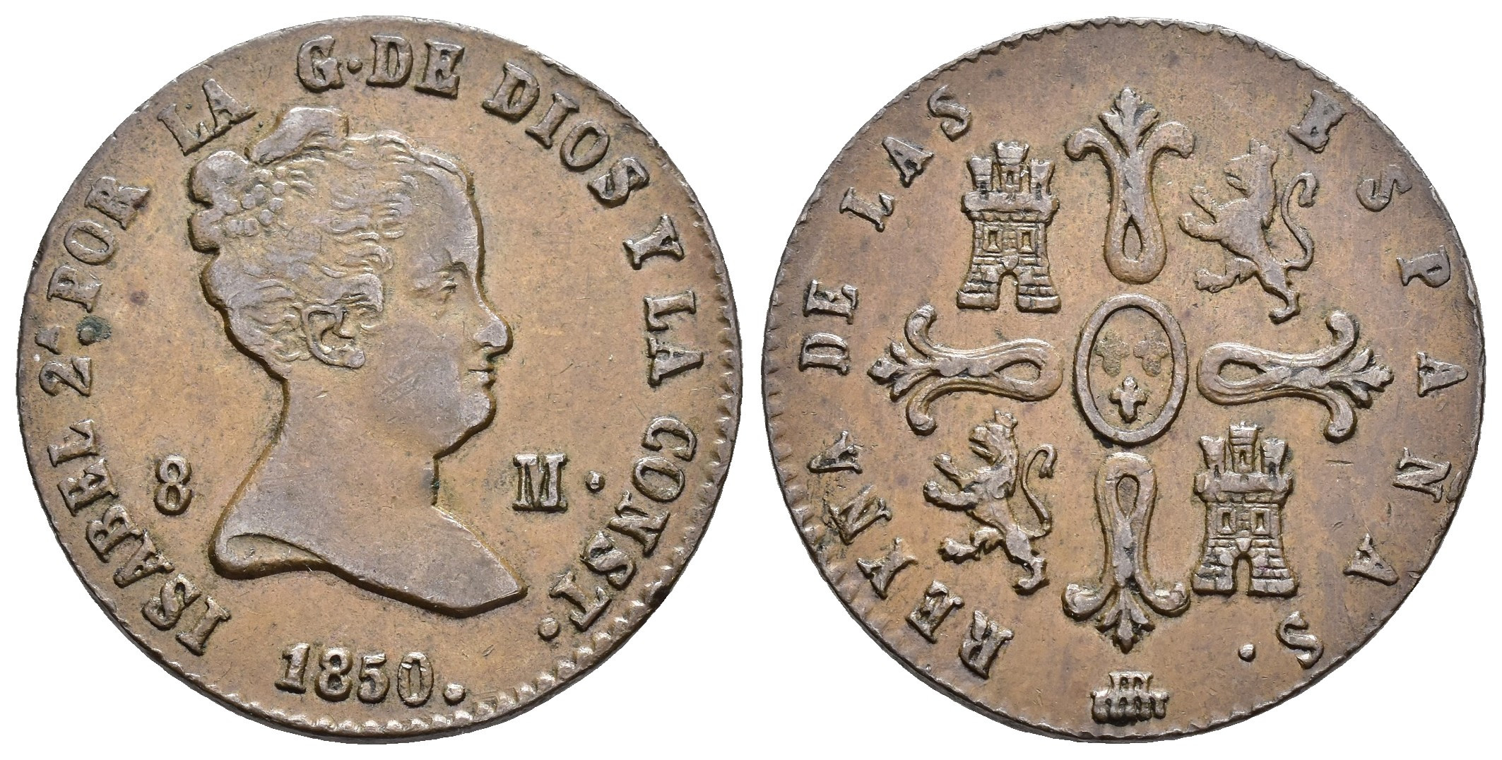 ISABEL II (1833-1868). Segovia. 8 maravedís. 1850. CU 10,06 g. 28,8 mm. VI-102; AC-137. MBC.