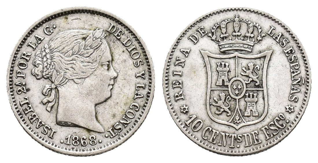 ISABEL II (1833-1868). Madrid. 10 céntimos de escudo. 1868*6-8. AR 1,3 g. 14,5 mm. VI-296; AC-341. Rayitas. MBC.