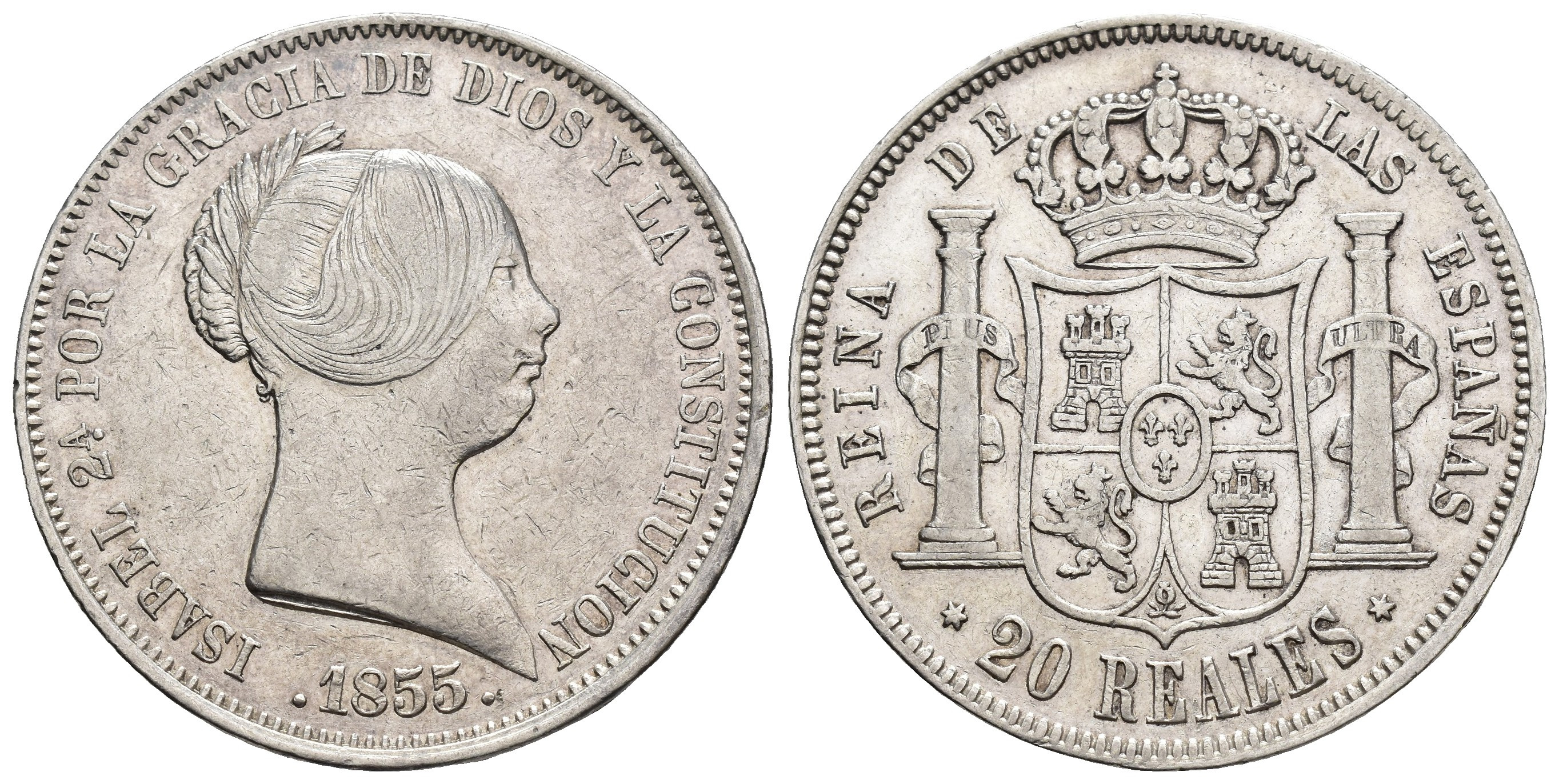 ISABEL II (1833-1868). Madrid. 20 reales. 1855. AR 25,62 g. 37 mm. VI-511; AC-597. Pequeñas marcas. MBC.