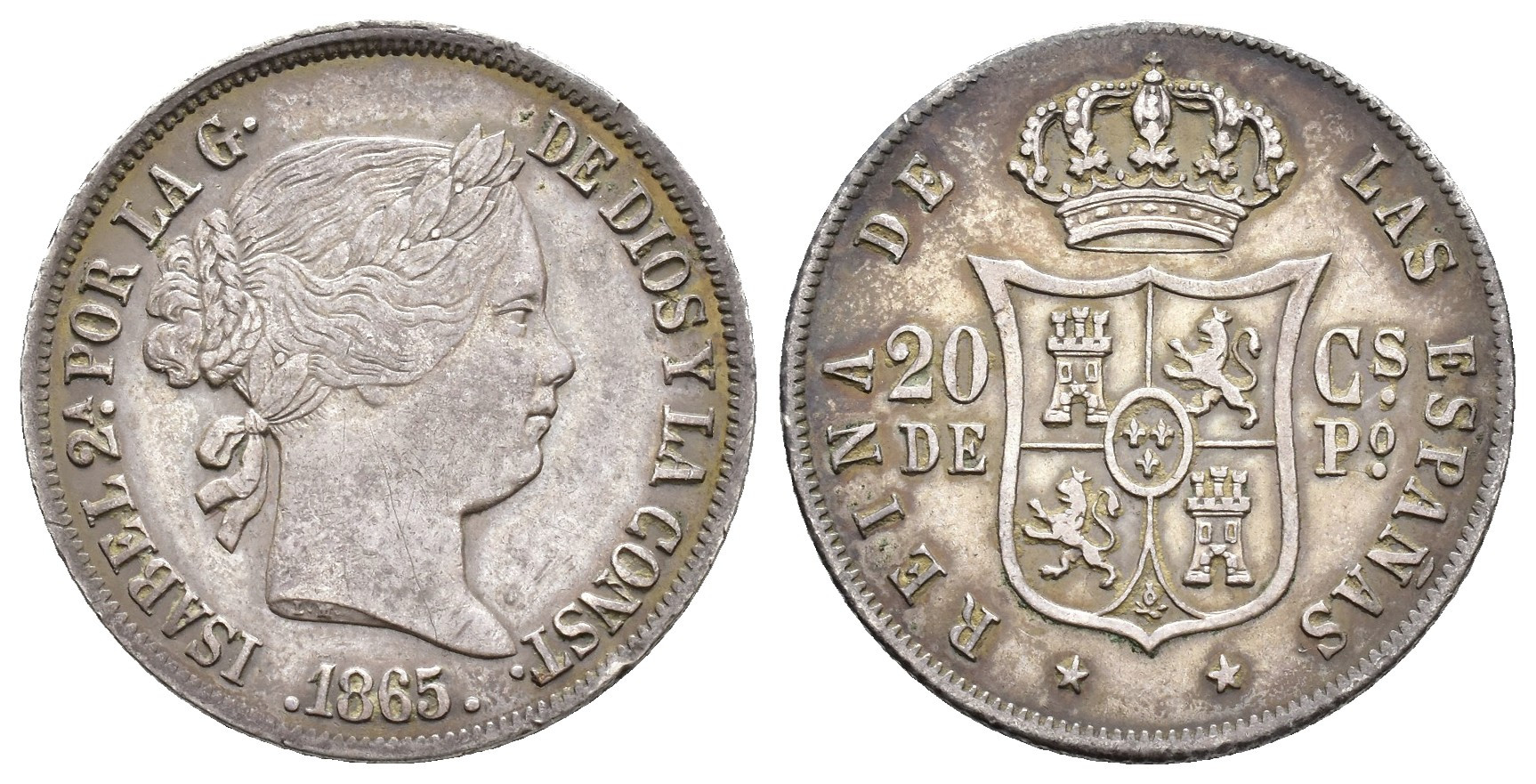 ISABEL II (1833-1868). 20 centavos de peso. 1865. Manila. AR 5,15 g. 23,2 mm. VI-548; AC-658. EBC-. Escasa.