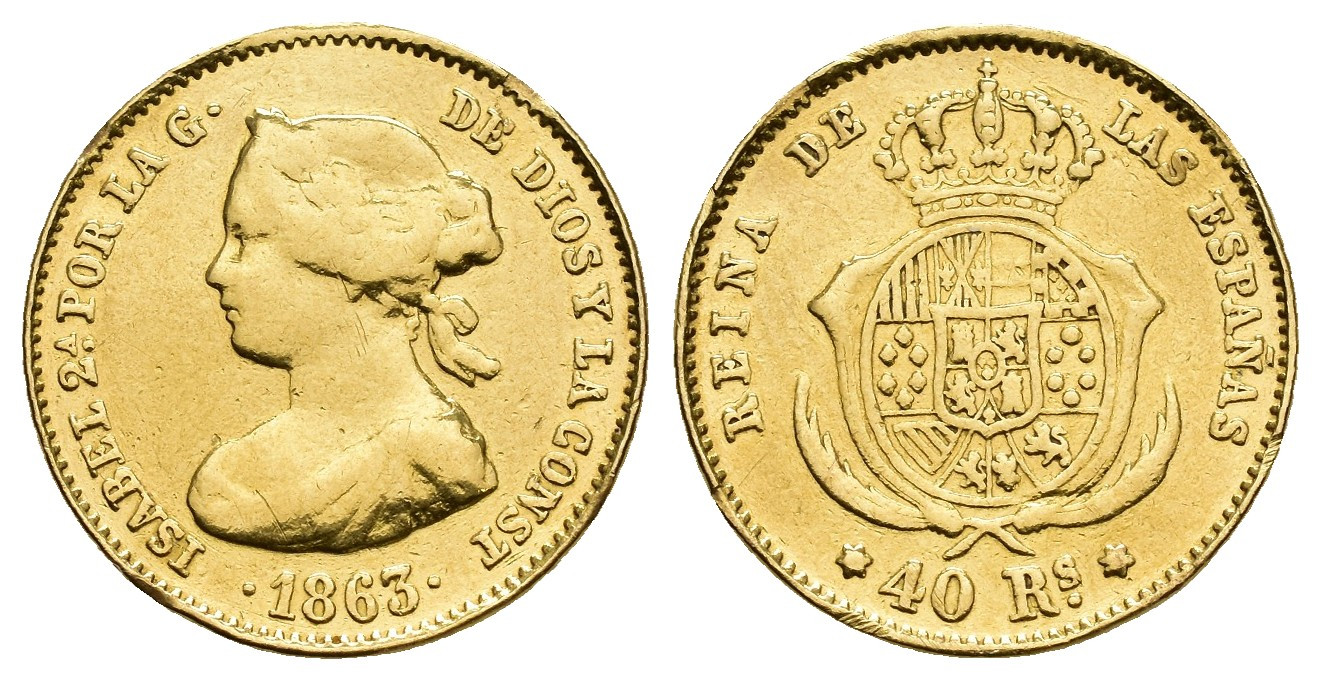 ISABEL II (1833-1868). 40 reales. 1863. Madrid. AU 3,30 g. 17,73 mm. VI-566. Varias soldaduras en canto. Estuvo engarzada. BC+.