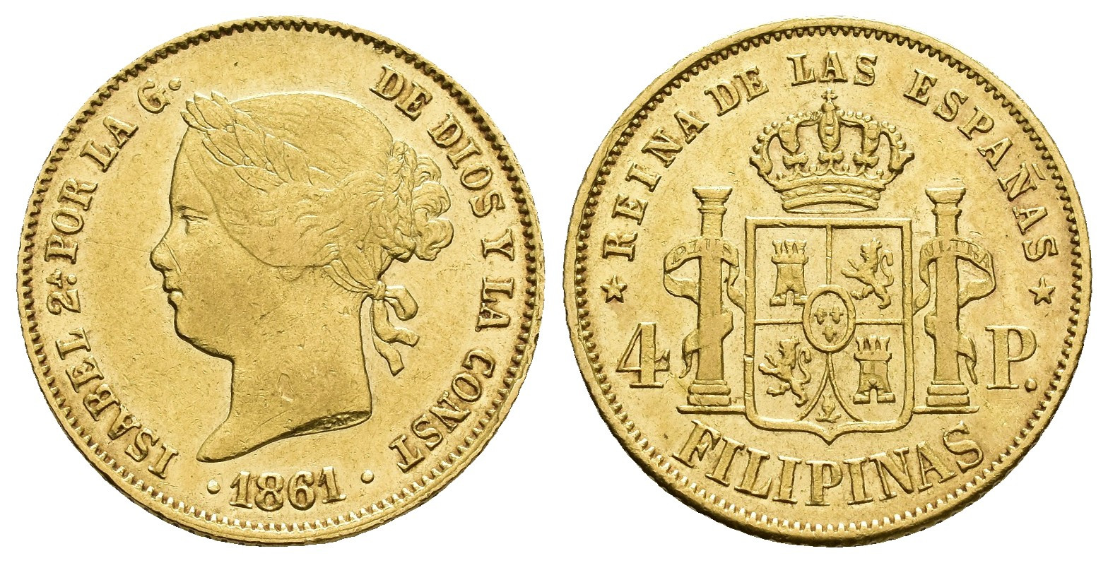 ISABEL II (1833-1868). Manila. 4 pesos. 1861. AU 6,72 g. 21,1 mm. VI-686; AC-852. Pequeñas marcas. MBC/MBC+.