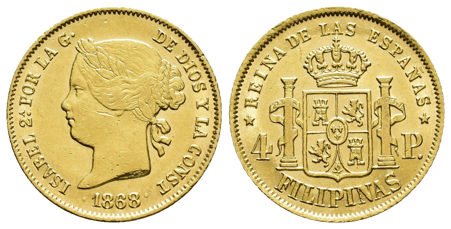 ISABEL II (1833-1868). Manila. 4 pesos. 1868. AU 6,82 g. 21 mm. VI-693; AC-865. Marquitas y rayita en anv. MBC+/EBC-.