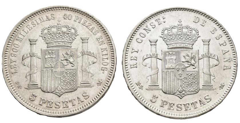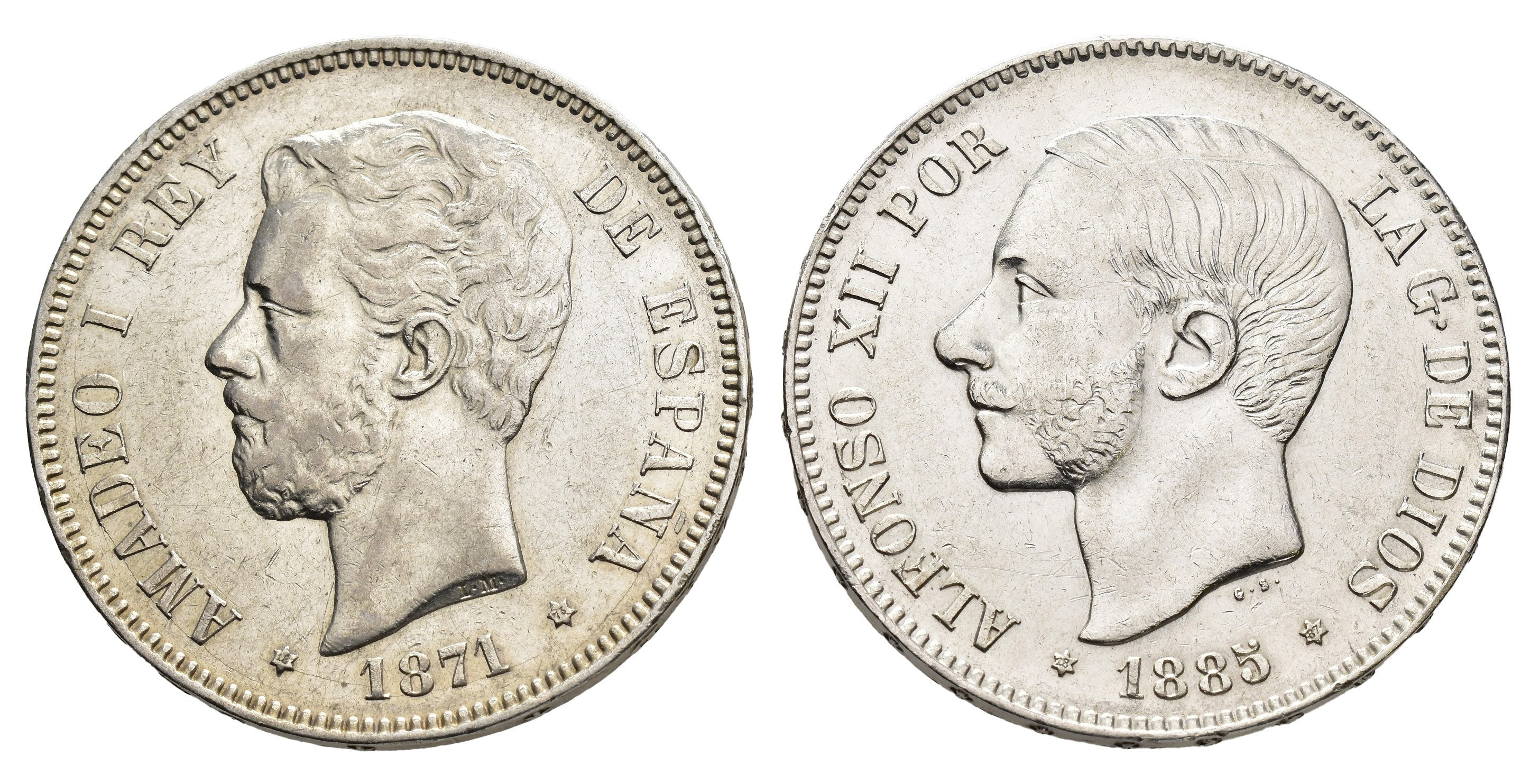 AMADEO I. Lote de 2 piezas de 5 pesetas: Amadeo I 1871*18-75 DEM y Alfonso XII 1885*18-87, MSM. MBC-/MBC+.