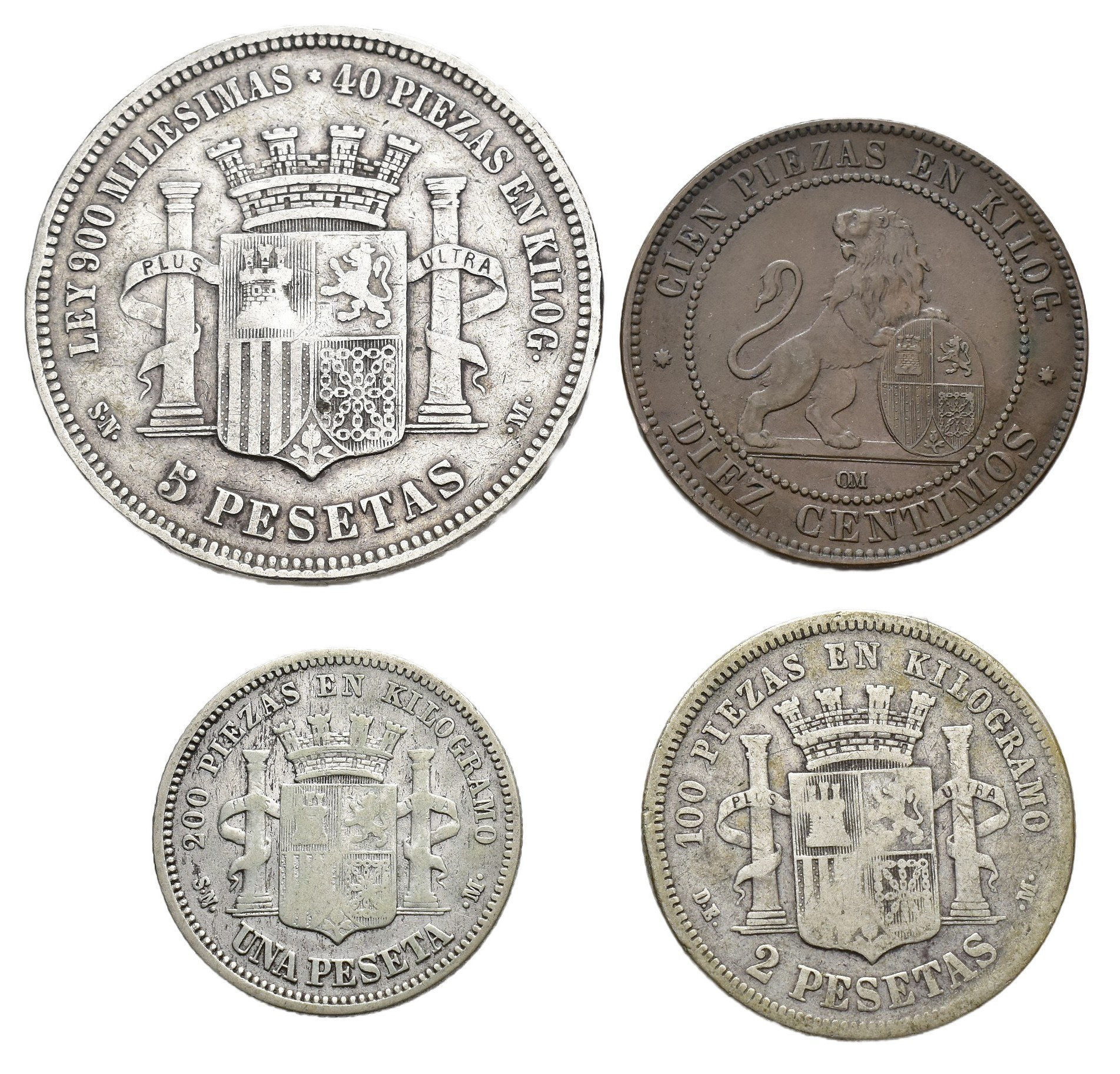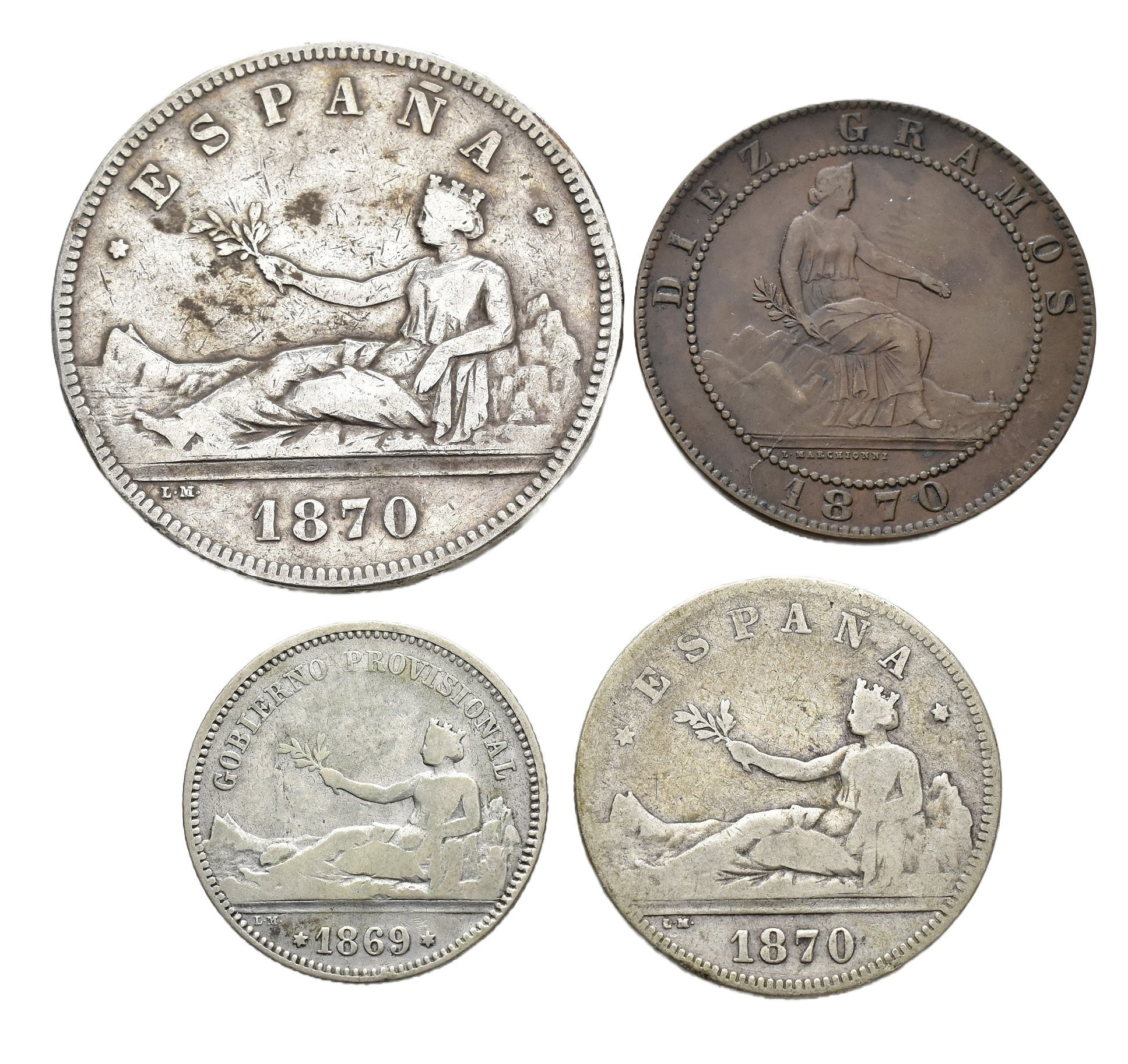 GOBIERNO PROVISIONAL Y I REPÚBLICA. lote de 4 piezas: 10 céntimos Barcelona 1870; 1 pta. 1869 SNM, 2 pts. 1870 DEM y 5 pts. 1870 SNM. BC/MBC-.