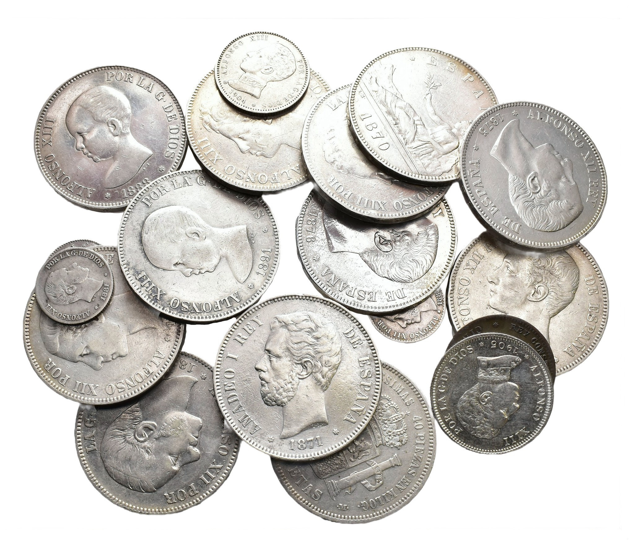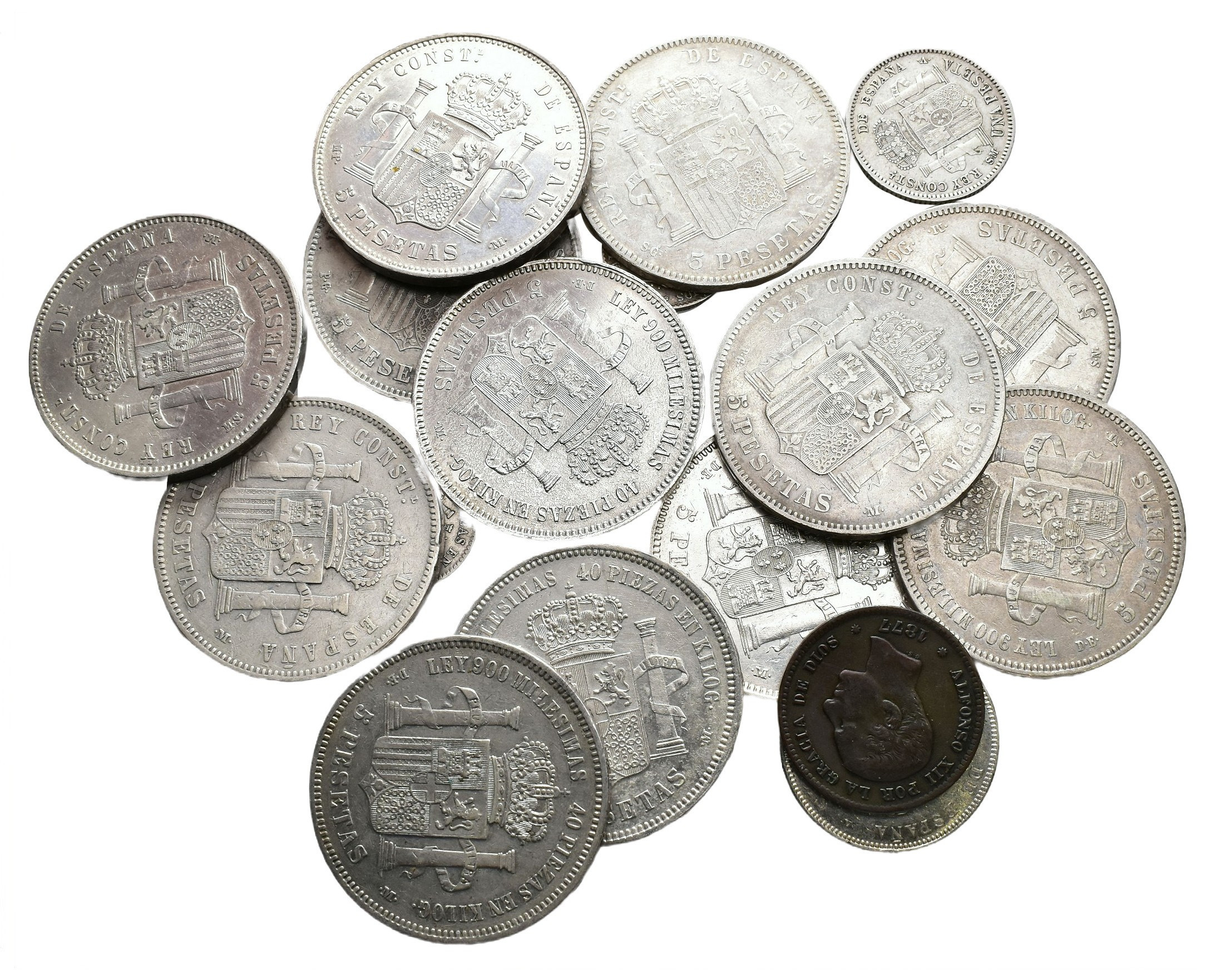ALFONSO XII. Lote de 18 piezas: 5 céntimos, 10 centavos, 50 céntimos (2), 1 pta., 2 pts. Y 5 pts. (12). De MBC- a EBC.