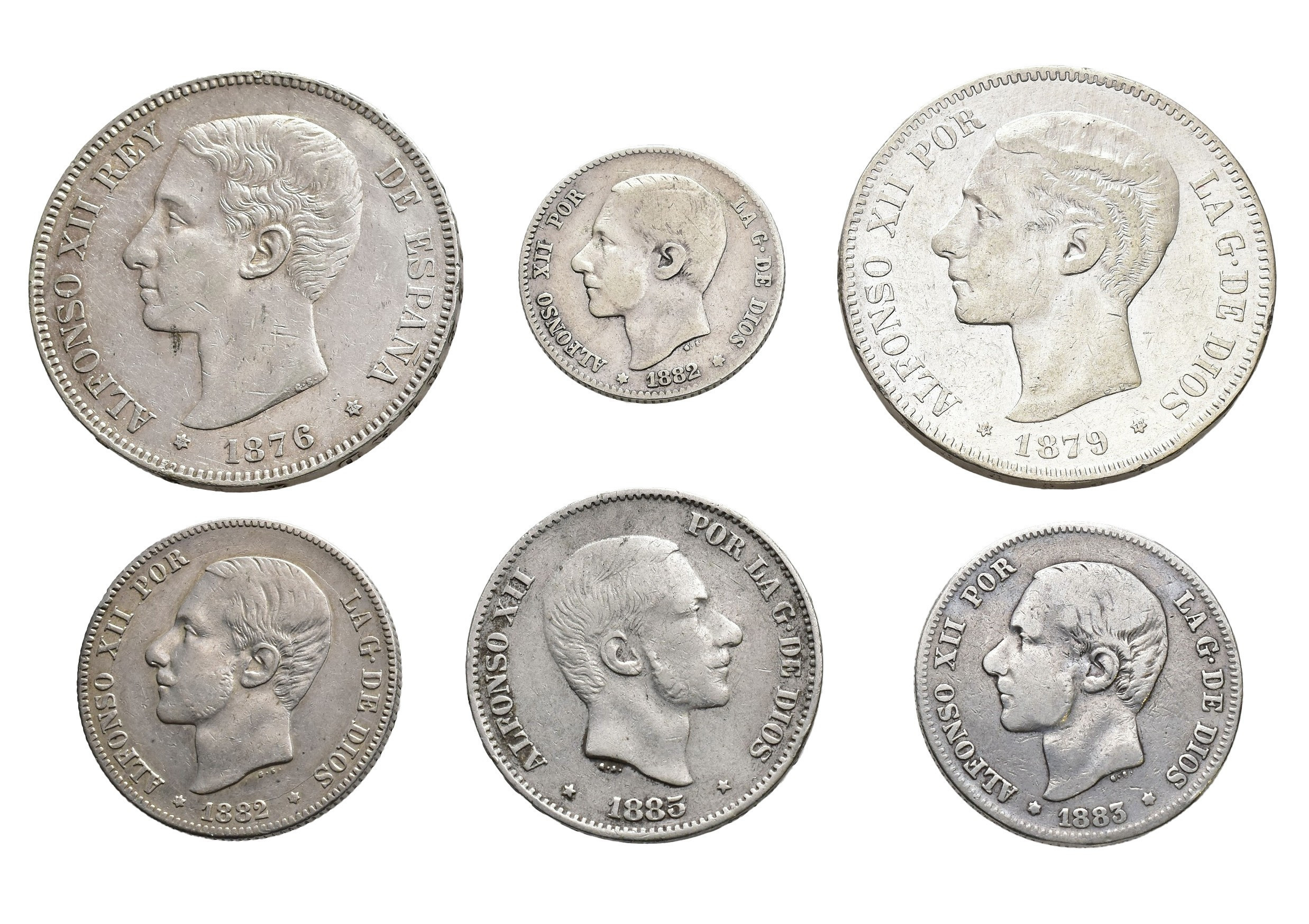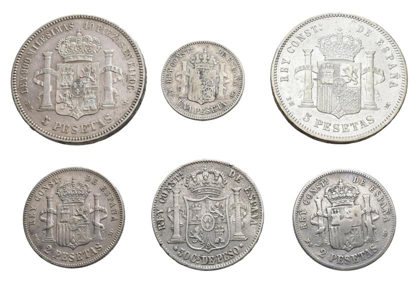 ALFONSO XII. Lote de 6 piezas: 50 centavos Manila 1885; 1 pta. Madrid 1882 MSM; 2 de 2 pts. Madrid 1882 MSM y 1883 MSM; 2 de 5 pts. Madrid 1876*18-76 DEM y 1879*18-79 EMM. MBC-/MBC+.