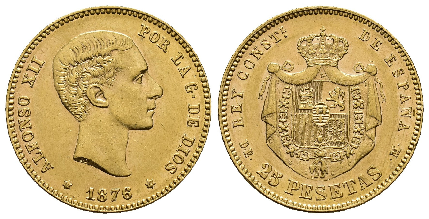 ALFONSO XII (1874-1885). Madrid. 25 pesetas. 1876*-76. DEM. AU 8,07 g. 24 mm. VII-103; AC-67. Pequeñas marcas. EBC+.
