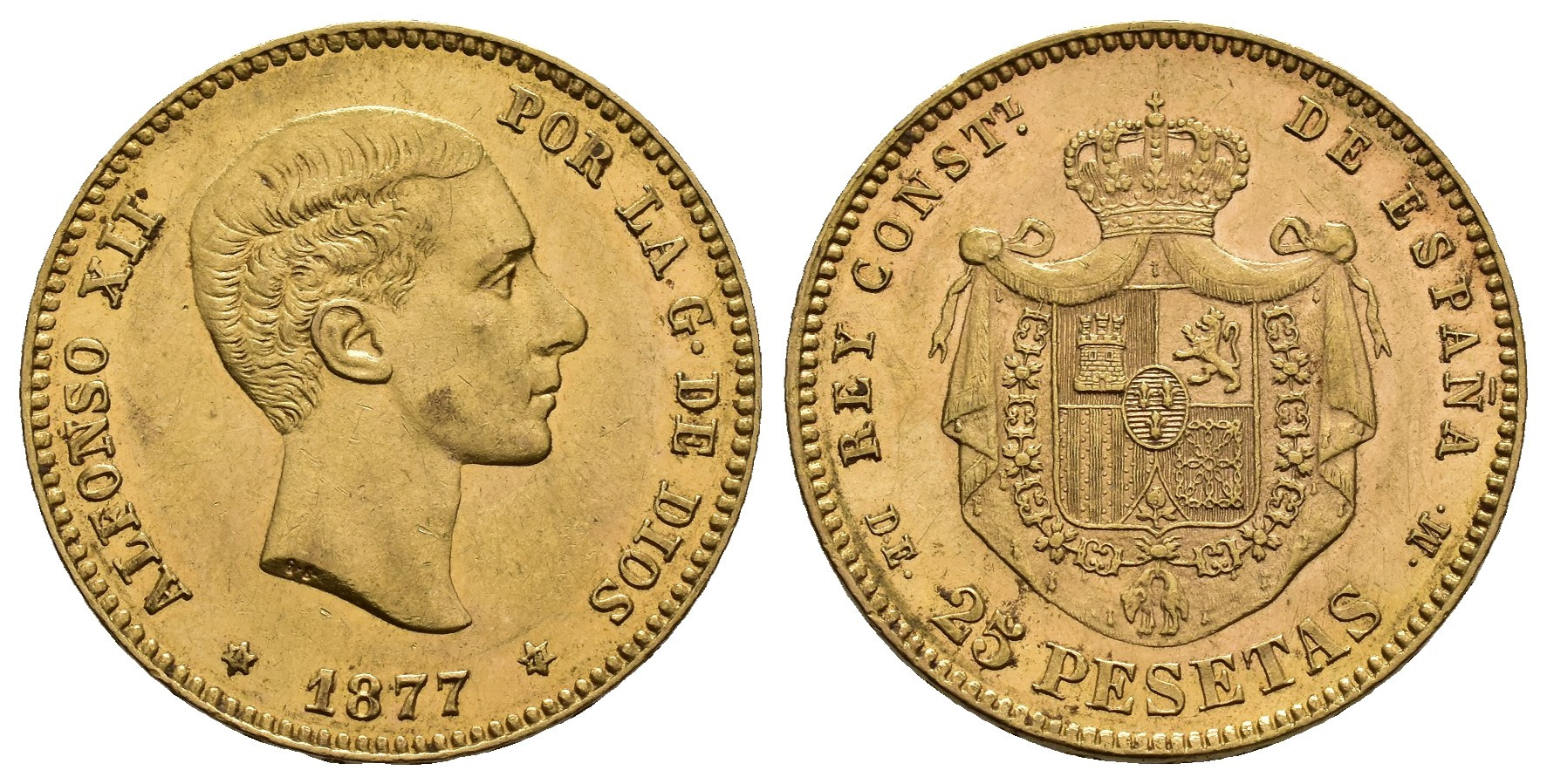ALFONSO XII (1874-1885). Madrid. 25 pesetas. 1877*-77. DEM. AU 8,06 g. 23,9 mm. VII-104; AC-68. EBC-.