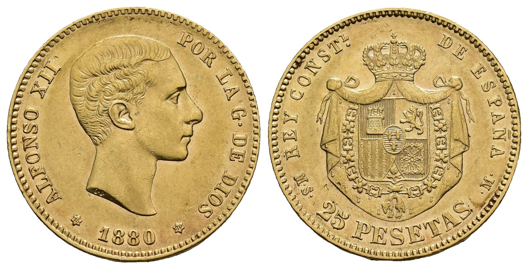 ALFONSO XII (1874-1885). Madrid. 25 pesetas. 1880*18-80. MSM. AU 8,06 g. 23,9 mm. VII-108; AC-79. Pequeñas marcas. MBC+.