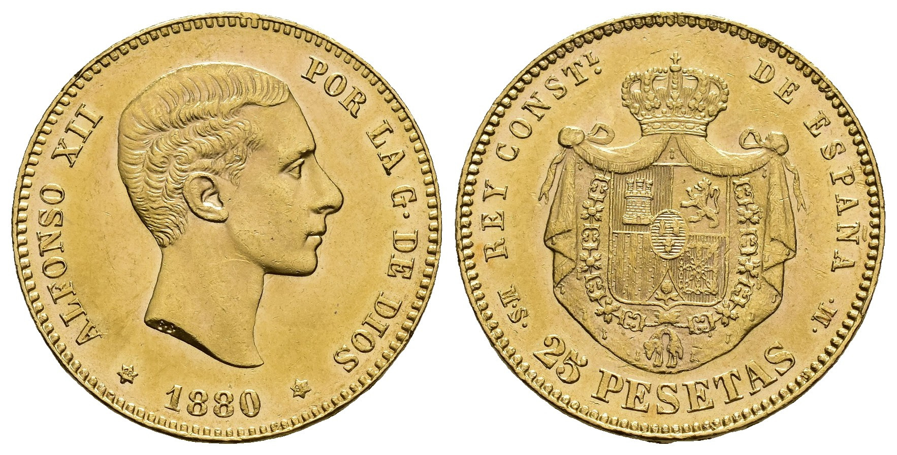 ALFONSO XII (1874-1885). Madrid. 25 pesetas. 1880*18-80. MSM. AU 8,09 g. 23,8 mm. VII-108; AC-79. Golpecito en gráfila. Pequeñas marcas. R.B.O. EBC-.