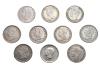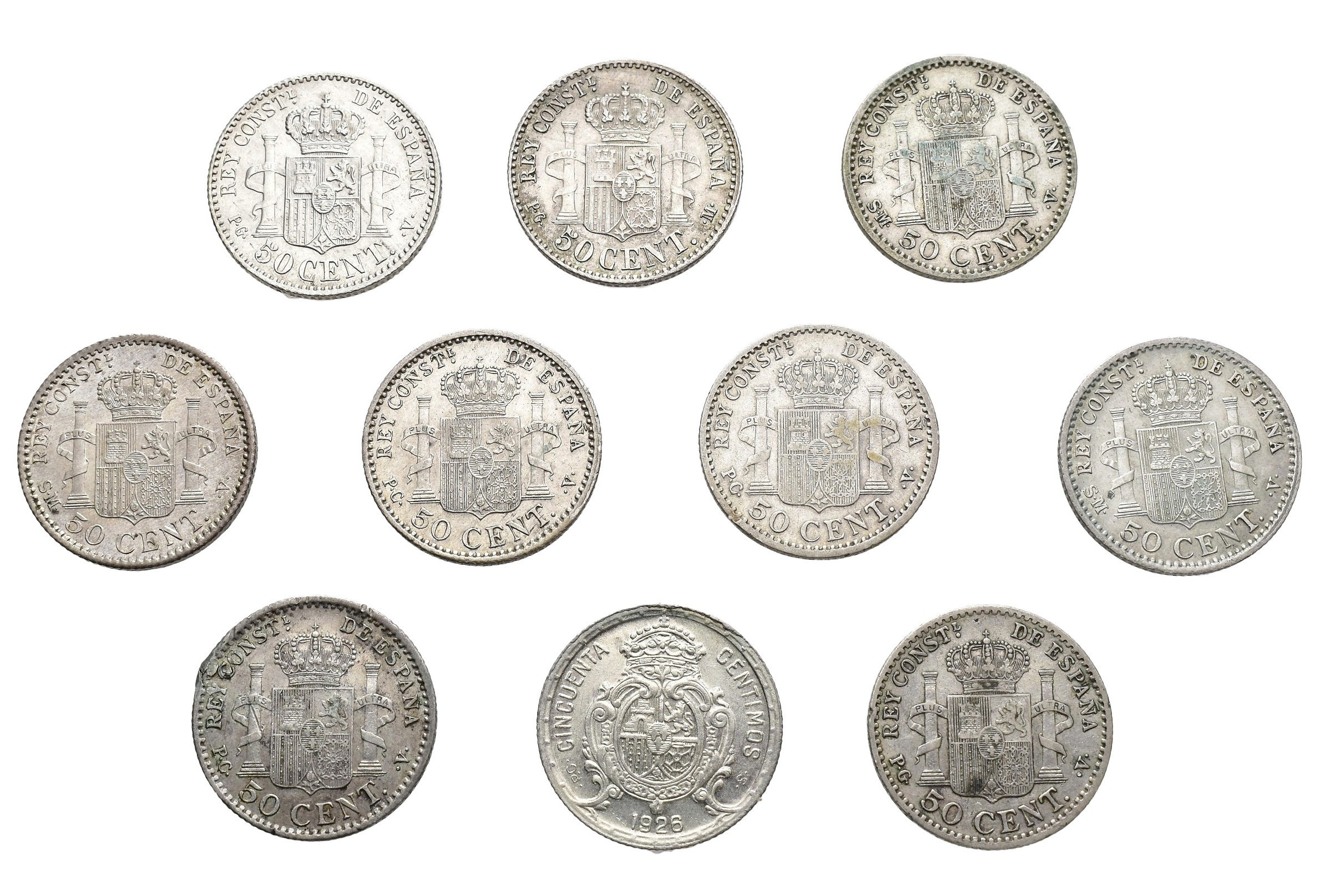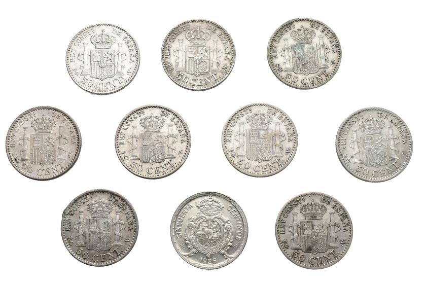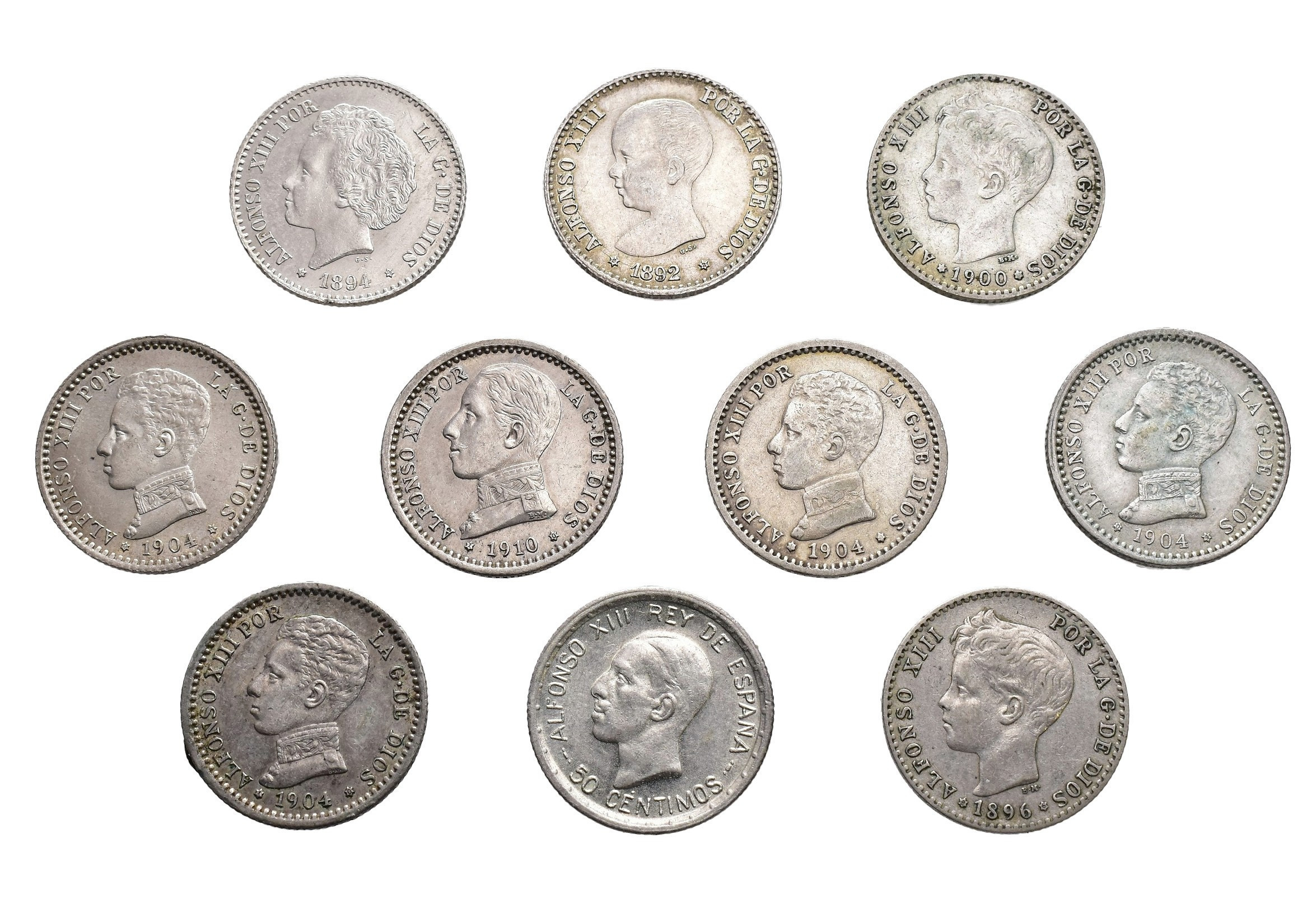 ALFONSO XIII. Lote de 10 piezas de 50 cts.: 1892 9-2, 1894*9.4, 1896 9.6, 1900, 1904*04 (2), 1.0 (2), 1910 1.0 y 1926. De MBC- a SC.