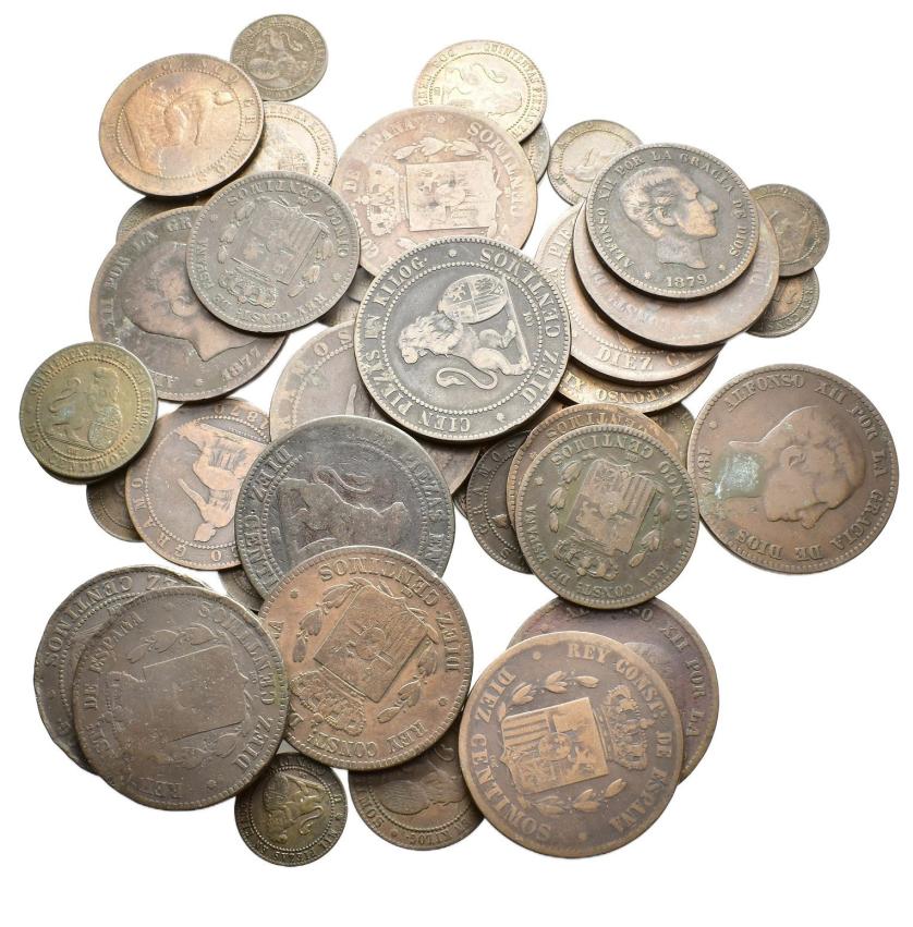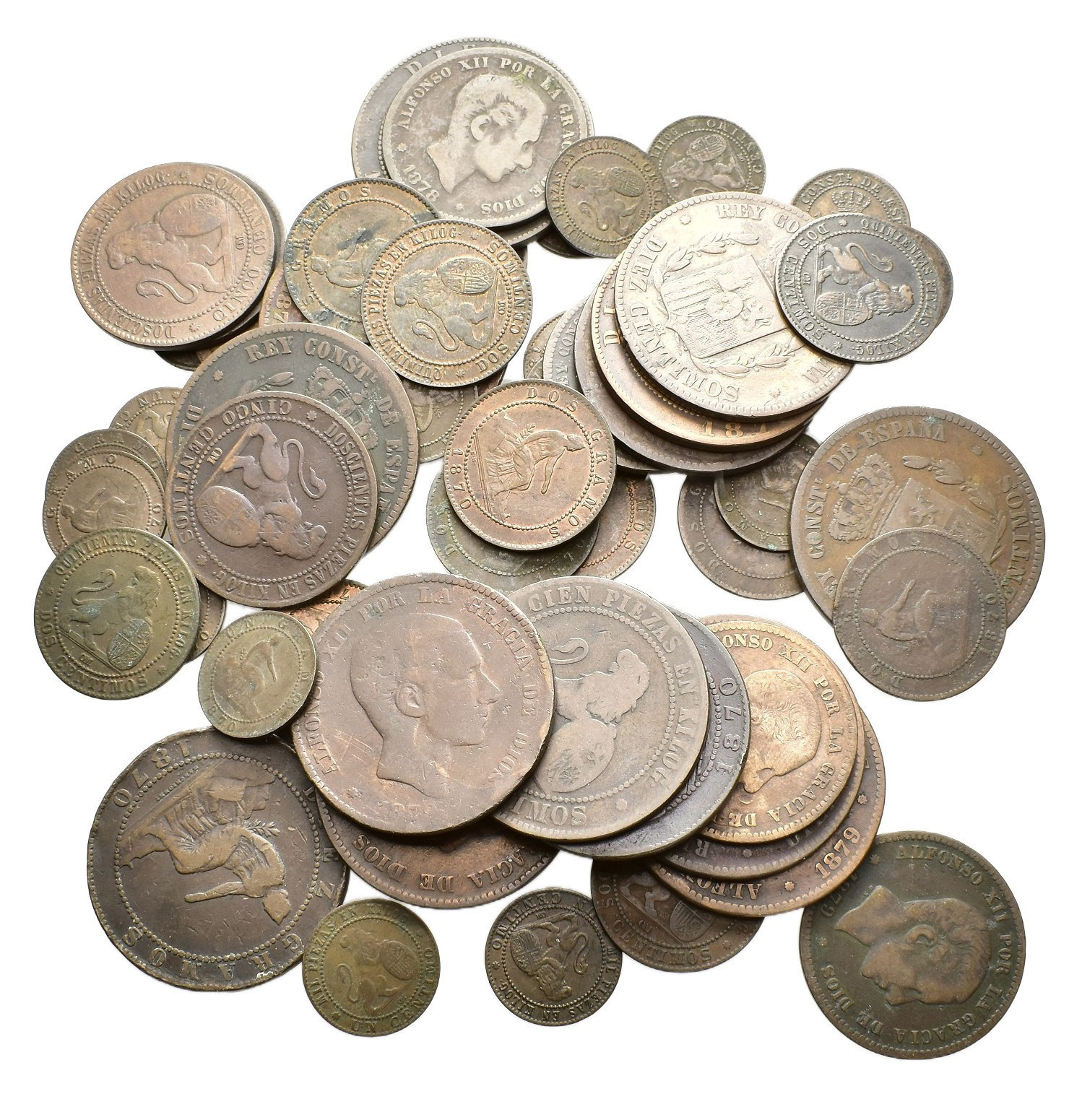 ALFONSO XIII. Lote de 5 piezas desde la I República a Alfonso XII: 1,2 5 y 10 cts. MC a MBC+.