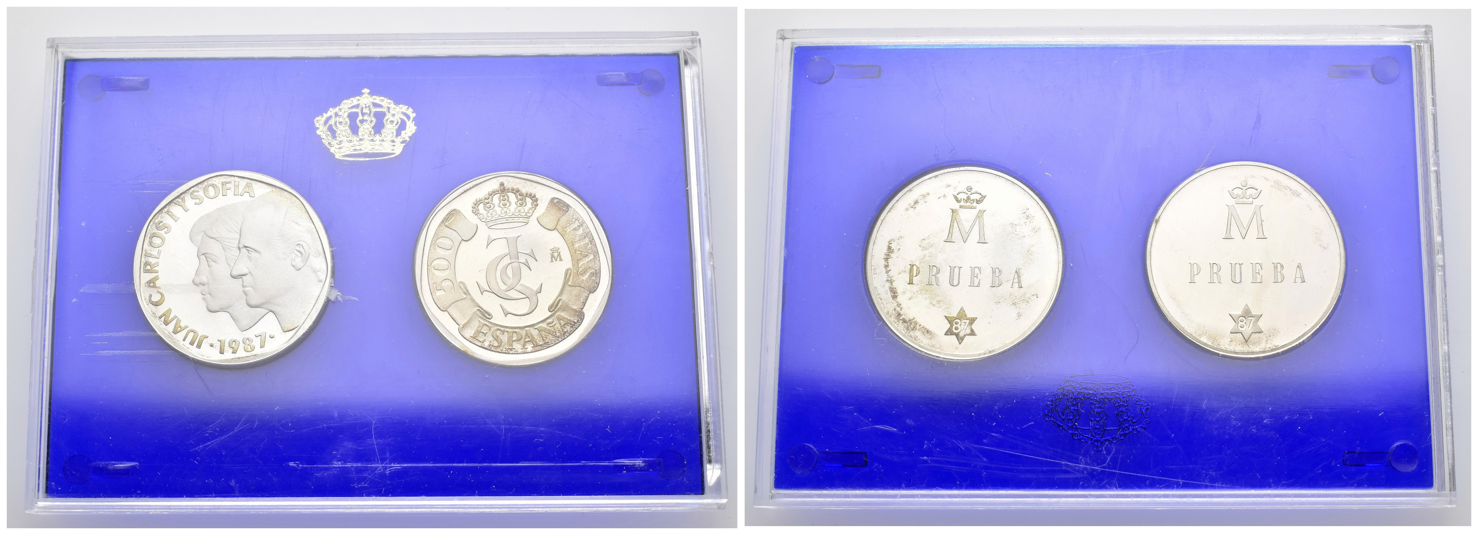 JUAN CARLOS I (1975-2014). Pruebas en plata de anverso y reverso de las 500 pts. 1987*87 del XXV Aniversario de las bodas de SS. MM. D. Juan Carlos y Dª Sofía. En los rev. marca de ceca, PRUEBA y *87. AR 12,6 g y calamina. Prueba.