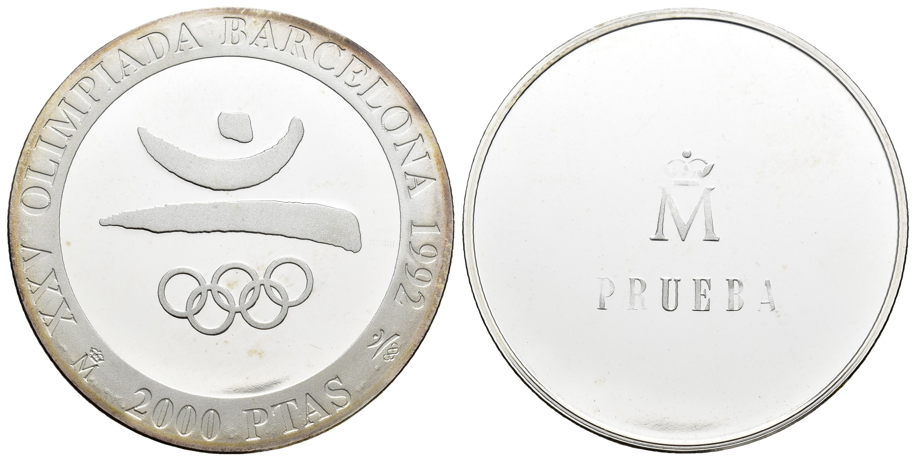 JUAN CARLOS I (1975-2014). Prueba de rev. de 2000 pts. 1990 Olimpiadas de Barcelona 1992. Emblema olímpico en rev. y marca de ceca de Madrid y prueba en anv. AR 27,01 g. 40 mm. Prueba.