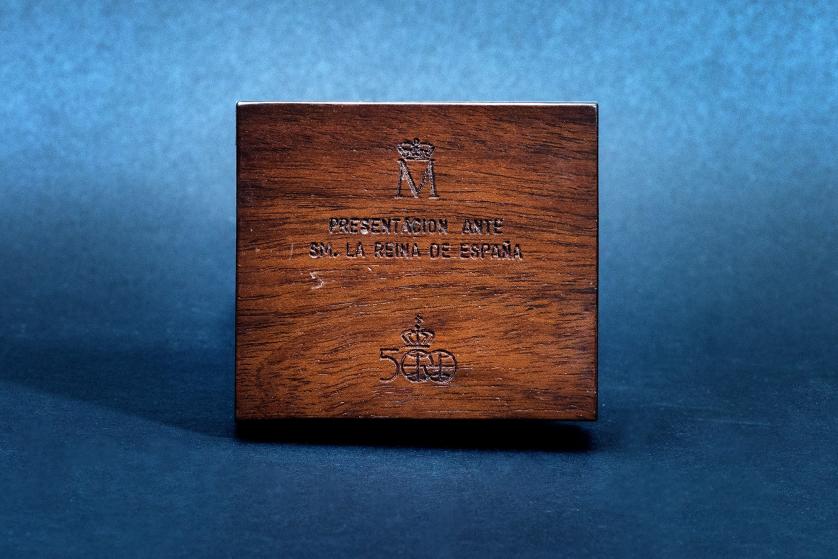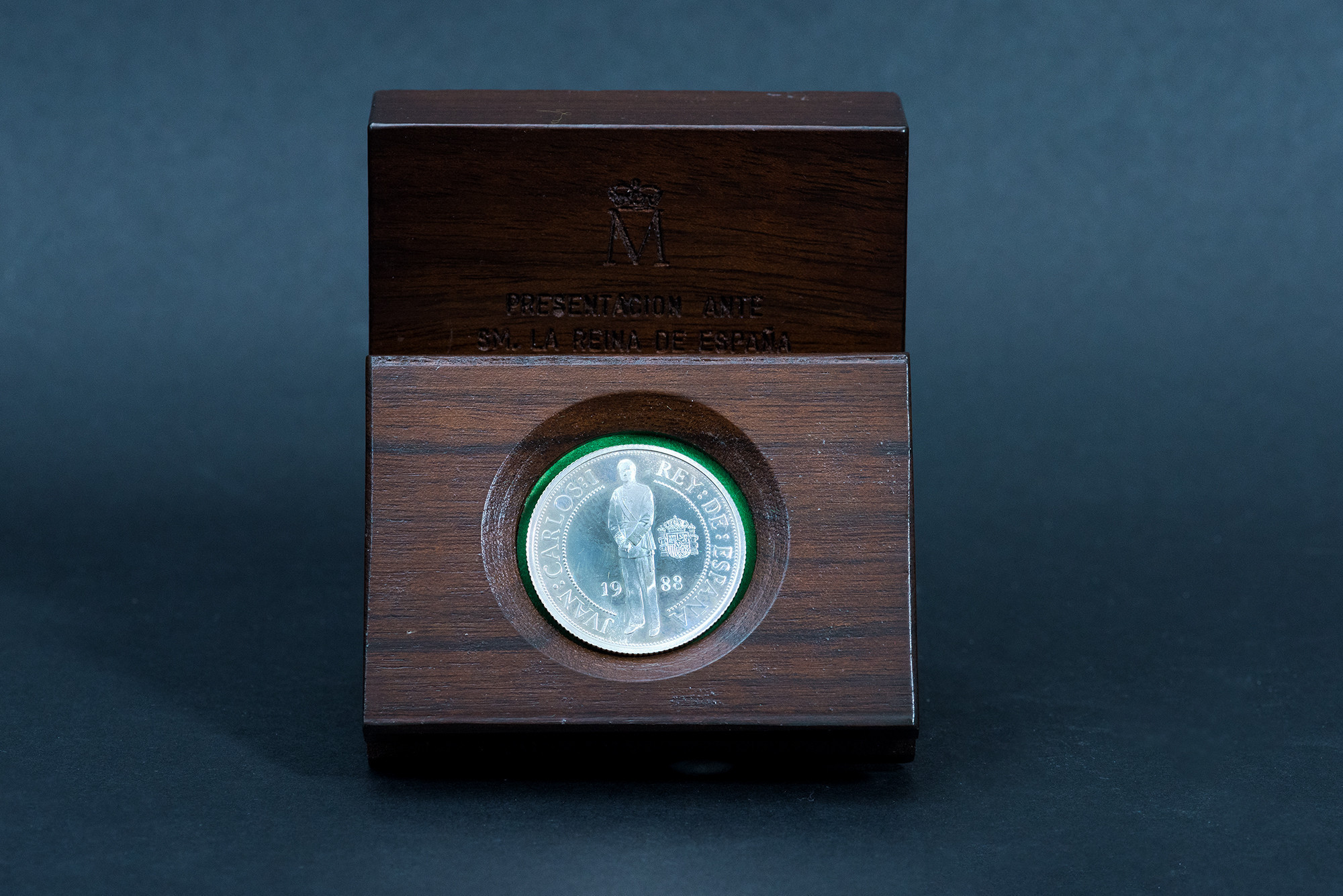 JUAN CARLOS I (1975-2014). Prueba en plata de las 40.000 pts. 1988 de V Centenario con valor 00000 pts. AR 9,82 g. 30 mm. En su estuche de presentación ante S.M. la reina de España. Prueba.