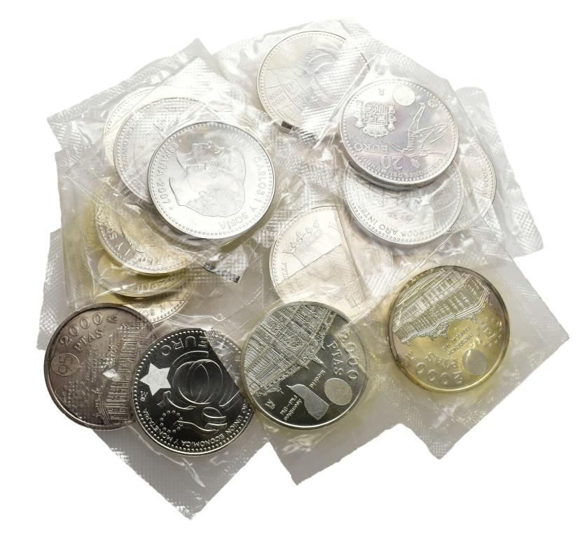 JUAN CARLOS I (1975-2014). Lote de 18 piezas: 2000 pts -1994, 1995 (2)-, 12 euros -2002 (2), 2003, 2004 (2), 2006 (2), 2007 (2), 2008 (2), 2009 (3)- y 20 euros de 2010. En envoltorio original. SC.