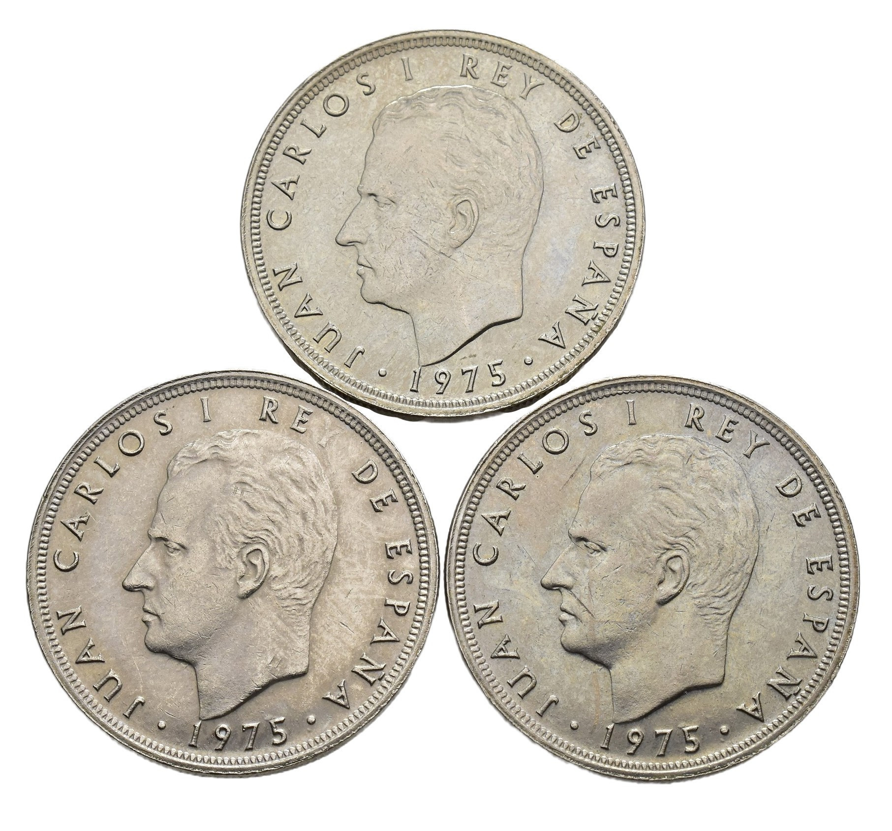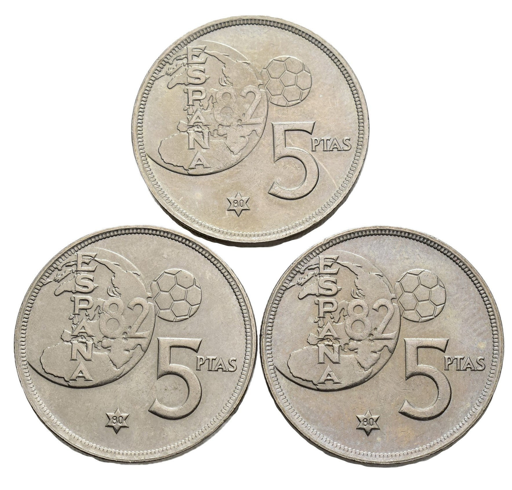 JUAN CARLOS I (1975-2014). Lote de 3 piezas de 5 pts. 1975*80. Error del Mundial. VII-456; AC-40. Pequeñas marcas. EBC-/EBC+.
