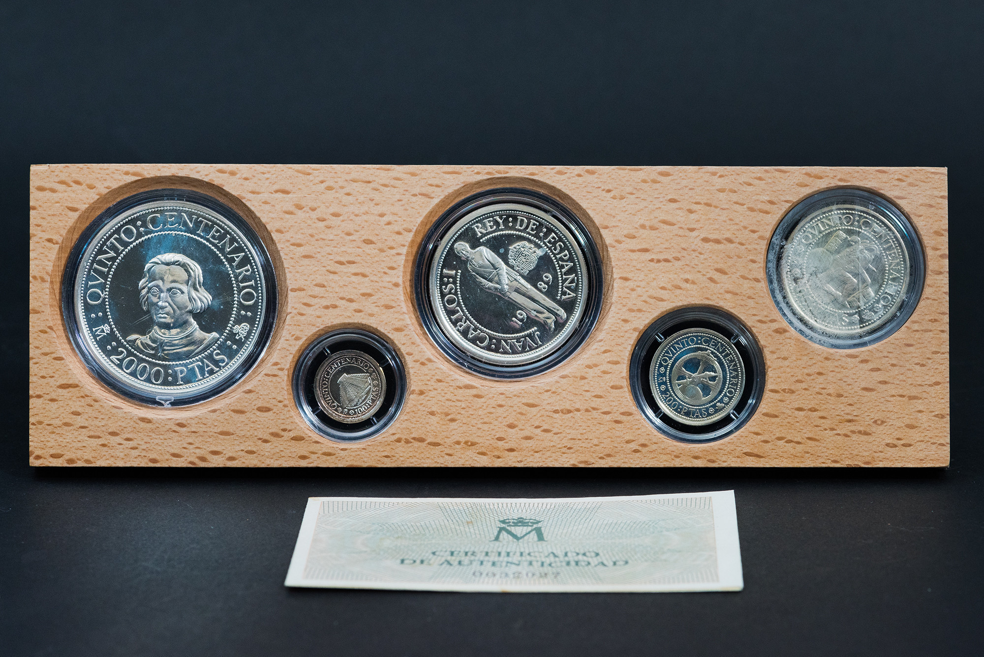 JUAN CARLOS (1975-2014). V Centenario. 1989. I. Estuche FNMT con 5 valores en plata: 100, 200, 500, 1000 y 2000 pts. AR. En su estuche y con certifiado. FDC.