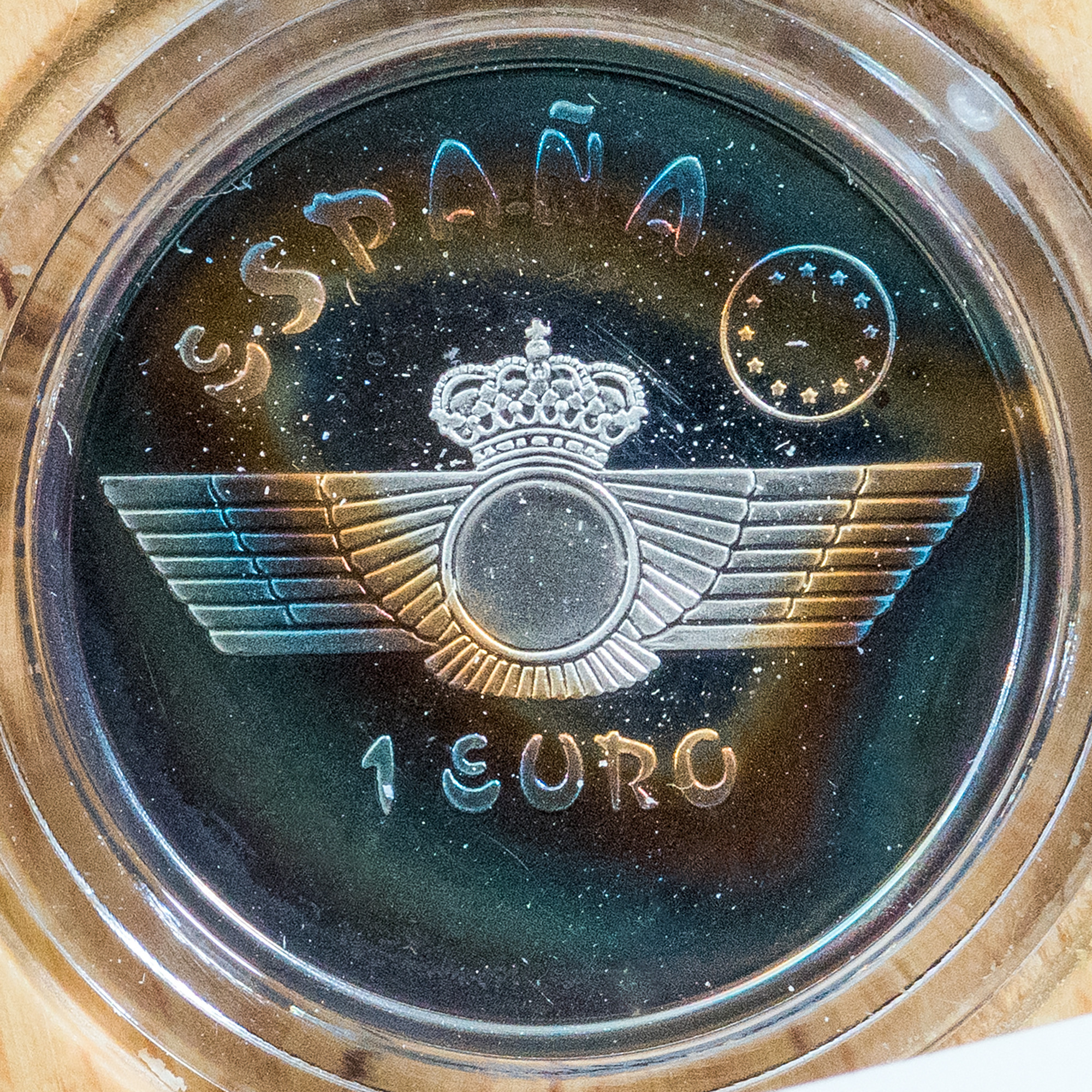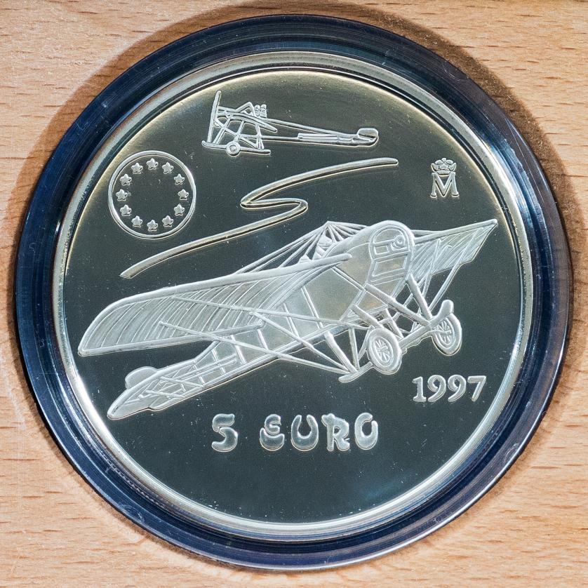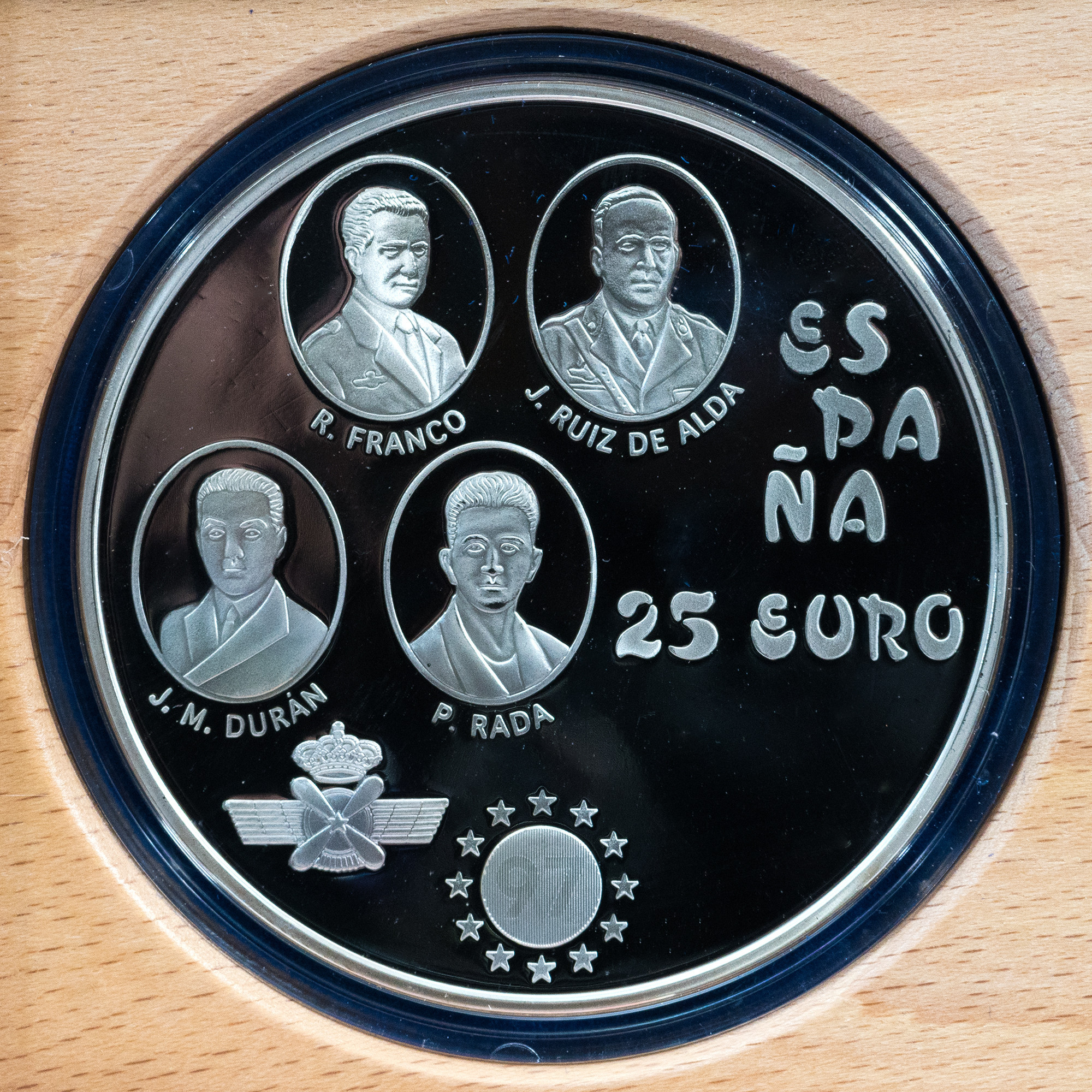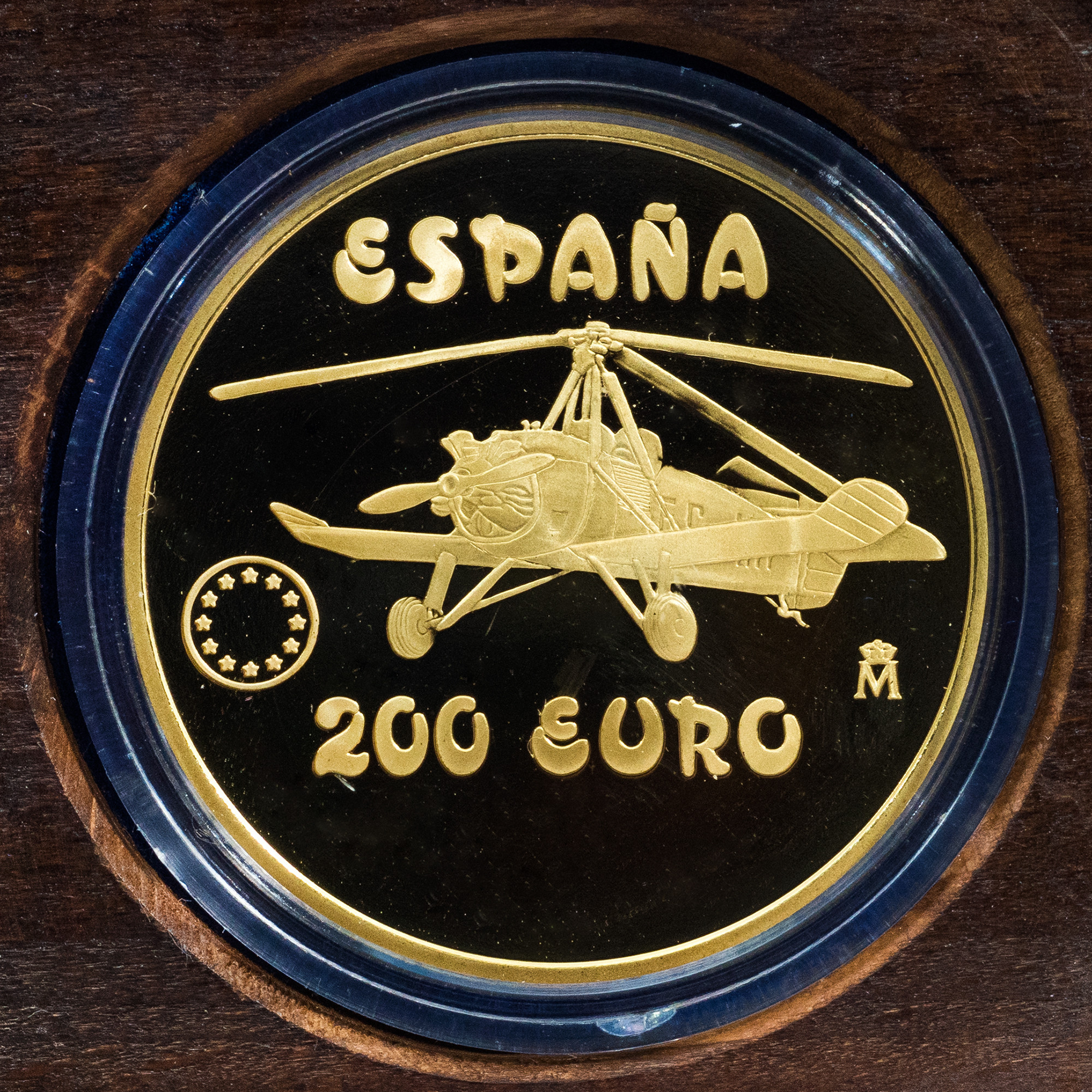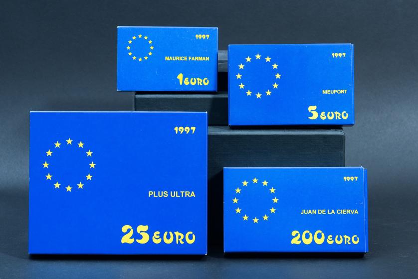 JUAN CARLOS I (1975-2014). Lote de 4 estuches: Homenaje a la Aviación Española. 1997. 1 euro (AR 6,72 g. 24 mm); 5 euros (AR 33,62 g. 42 mm.); 25 euros (AR 168,75 g. 73 mm.) y 200 euros (AU 34,55 g. 40 mm.). En sus cajas y con certificados (falta tapa en la de 1 euro). FDC.