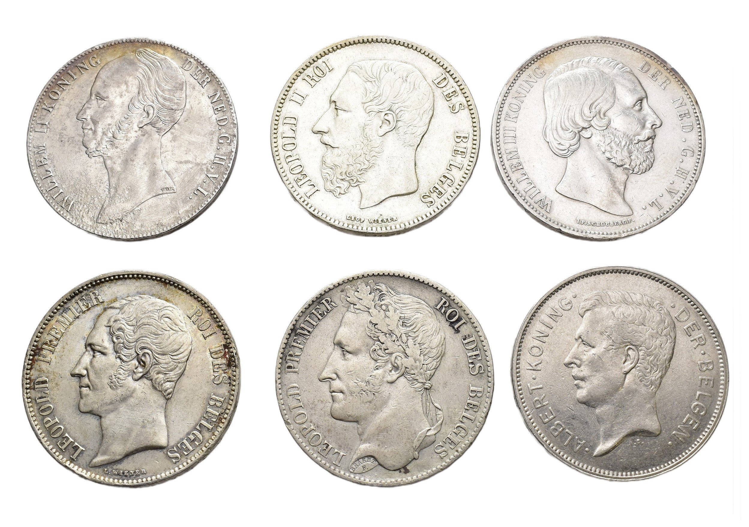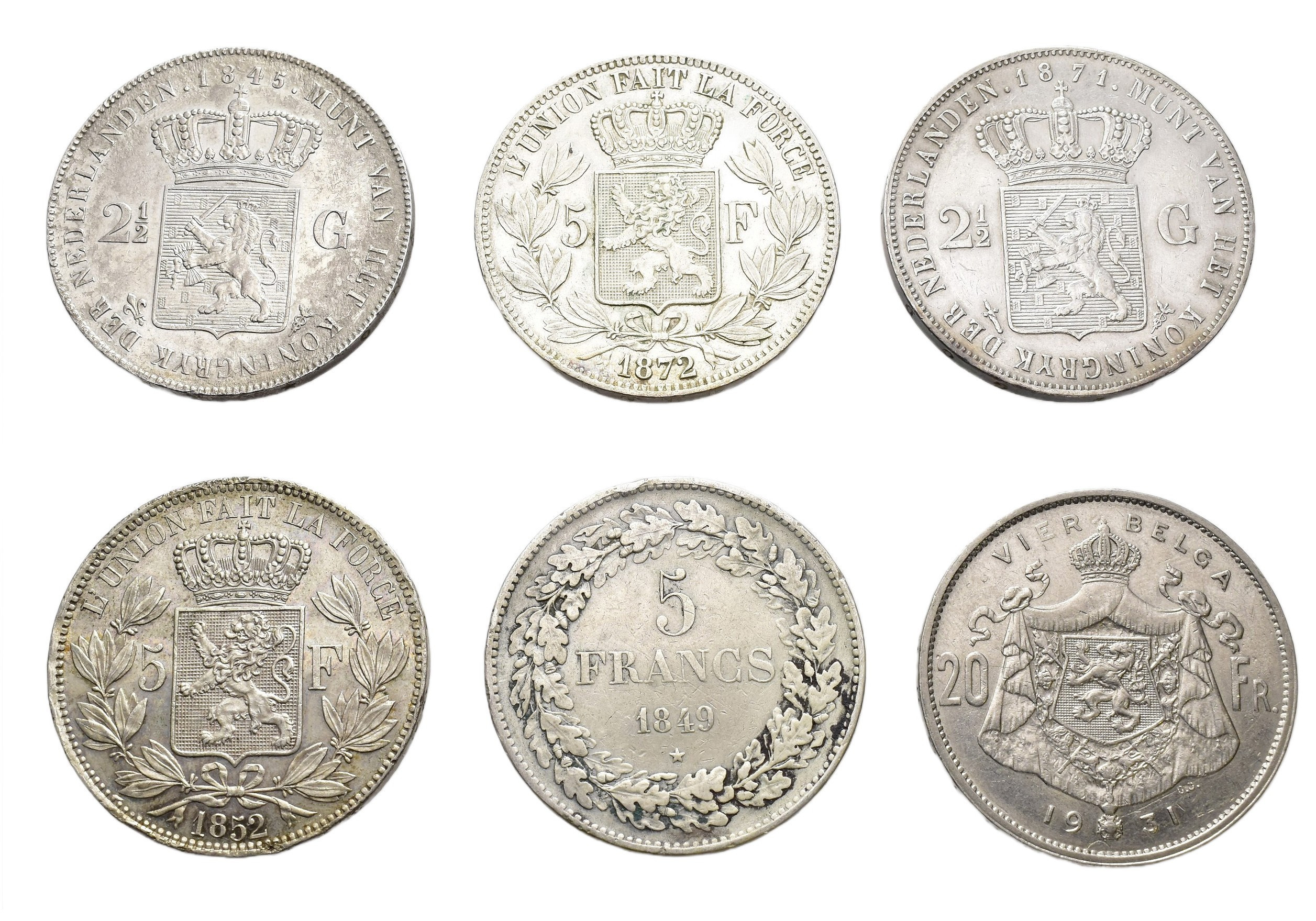 MONEDA EXTRANJERA. Lote de 6 piezas de Bélgica y Holanda: 5 francos 1849, 1852 y 1872, 20 francvos 1931 BELGEN de Bélgica y 2 1/2 Gulden de 18454 y 1871 de Holanda. MBC- a EBC-.