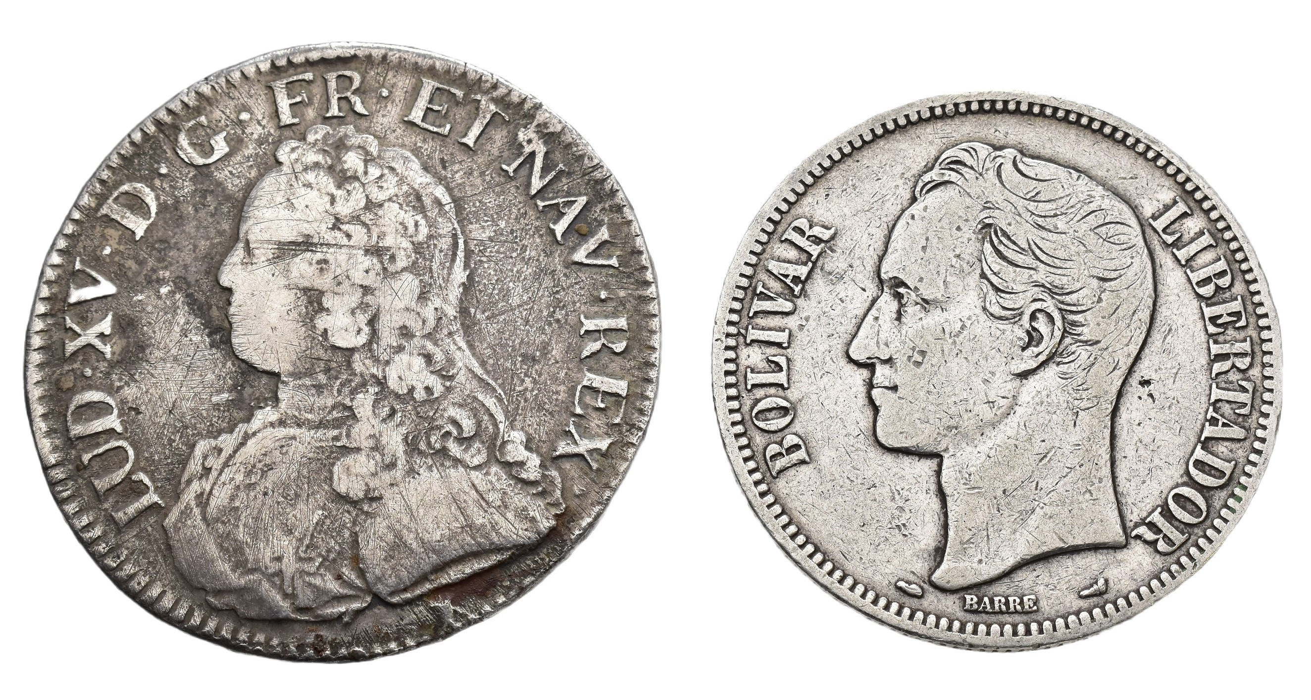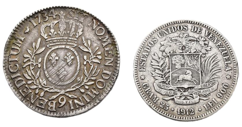 MONEDA EXTRANJERA. Lote de 2 piezas: 1 écu 1734-9, Luis XV de Francia y 1 bolívar de 1912 de Venezuela. BC+/MBC-.