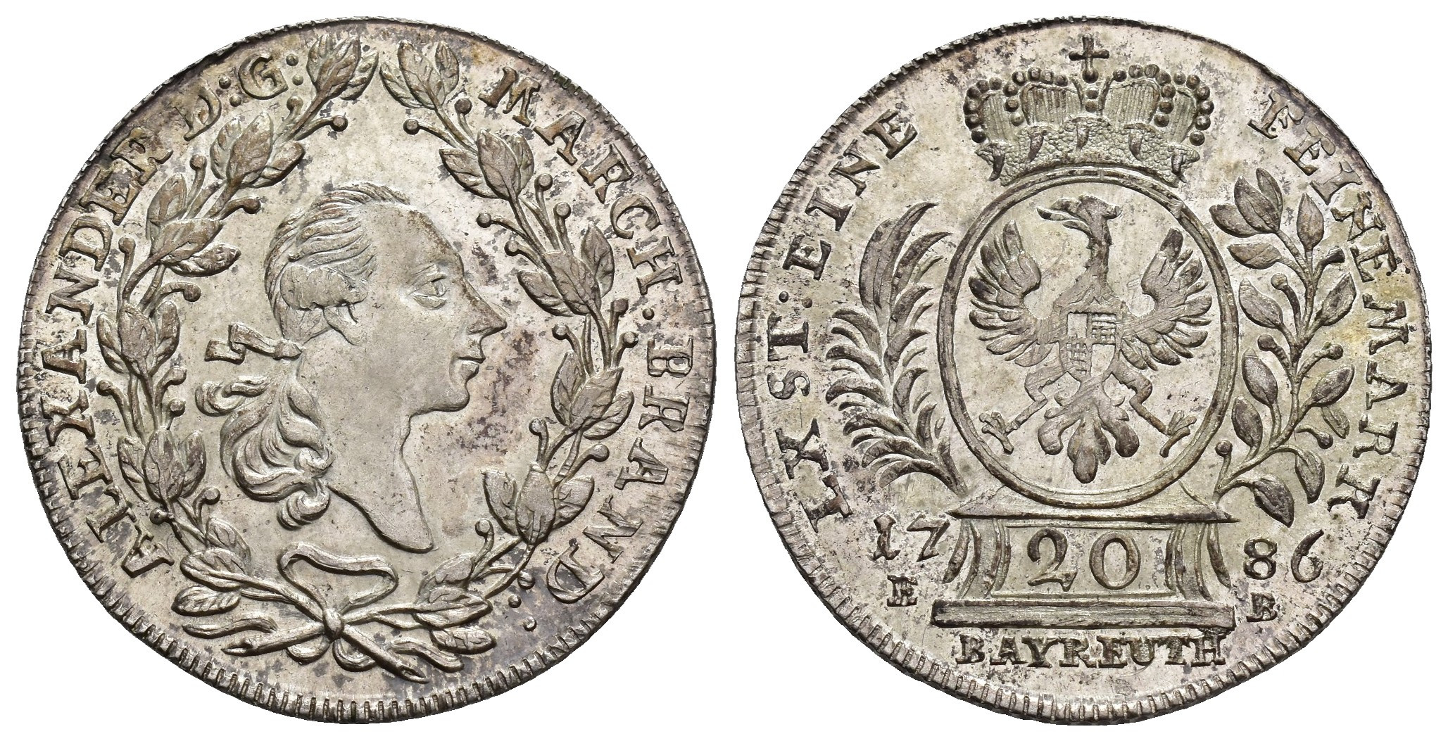 MONEDA EXTRANJERA. ALEMANIA Y ESTADOS ALEMANES. BRANDEBURGO-BAYREUTH. Carlos Alejandro. 20 Kreuzer. 1786. EB. KM-272.2. AR 6,61 g. 28,1 mm. B.O. EBC.