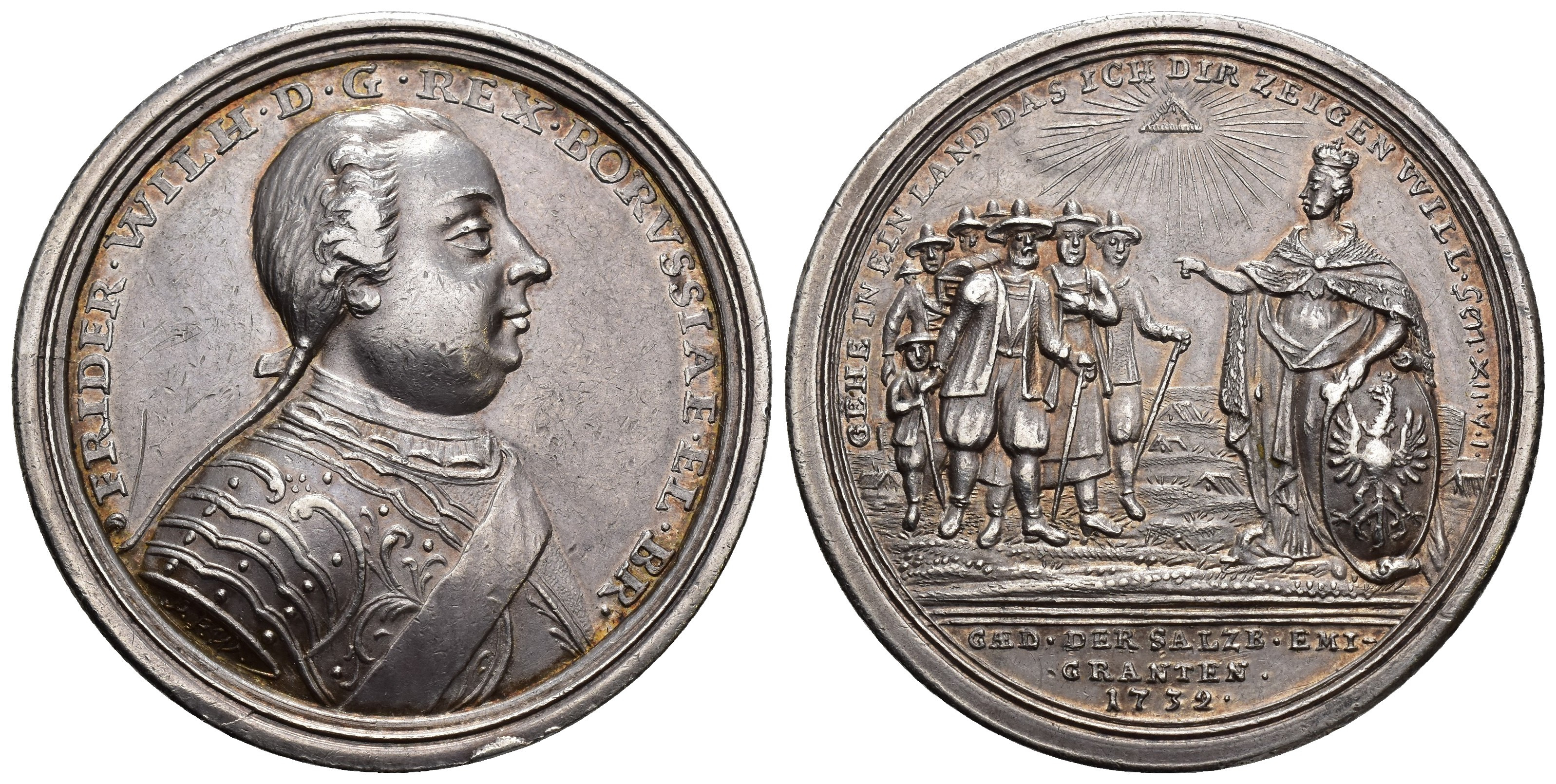 MONEDA EXTRANJERA. ALEMANIA Y ESTADOS ALEMANES. BRANDEBURGO-PRUSIA. Federico Guillermo. Medalla. 1732. Busto del rey a der. Prusia recibiendo a un grupo de emigrantes de Salzburgo. Firmado en el corte del brazo P.P. W. (Werner) AR 29,02 g. 43,5 mm. Slg. Whiting 466. Pequeñas marcas. EBC-.