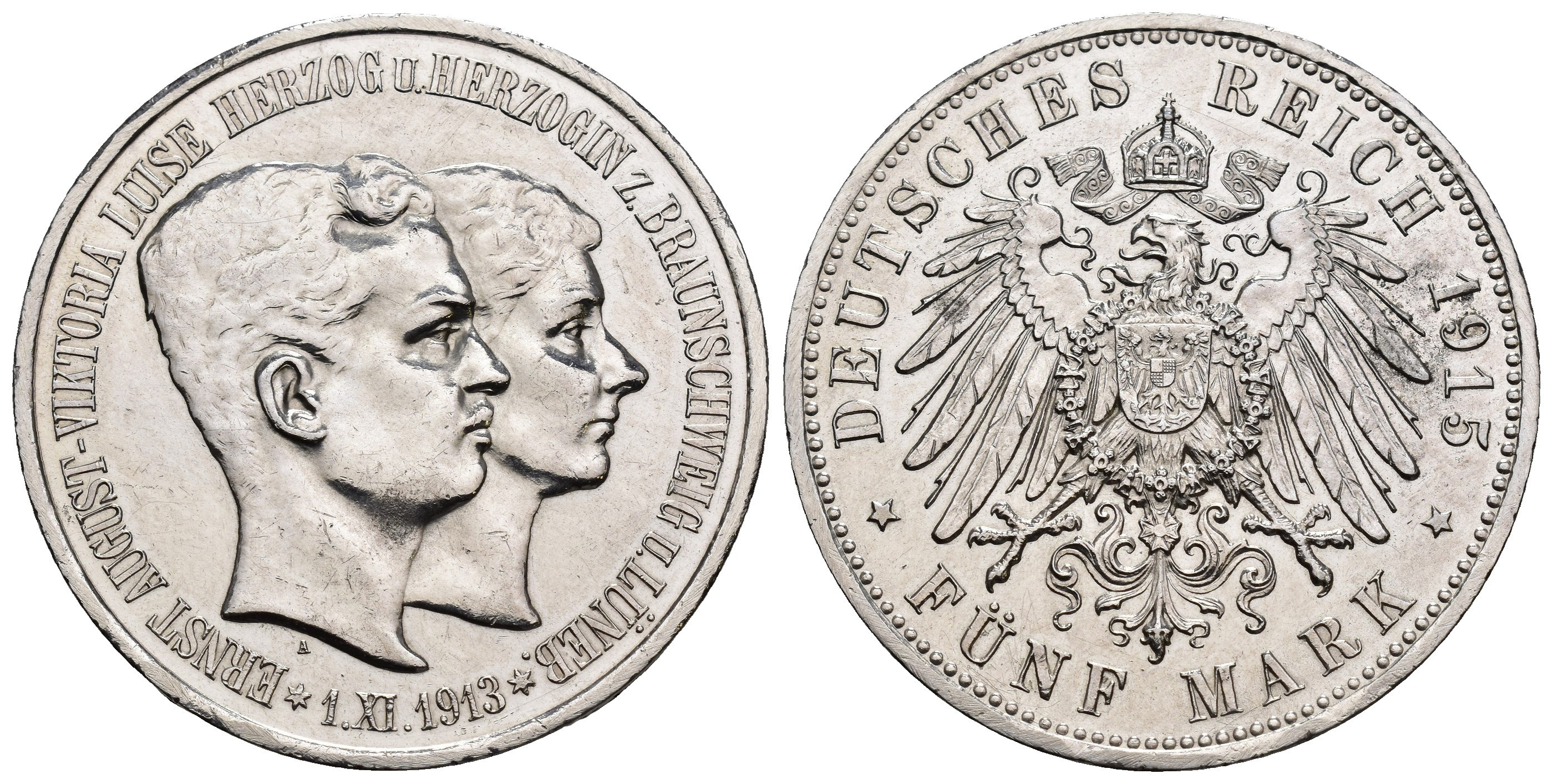 MONEDA EXTRANJERA. ALEMANIA Y ESTADOS ALEMANES. BRUNSWICK-LUNEBURGO. Ernesto Augusto. 5 marcos. 1915. Ley. U. LÜNEB. AR 27,79 g. 38 mm. KM-1164. B.O. Raya en anv. Rayitas en rev. EBC.