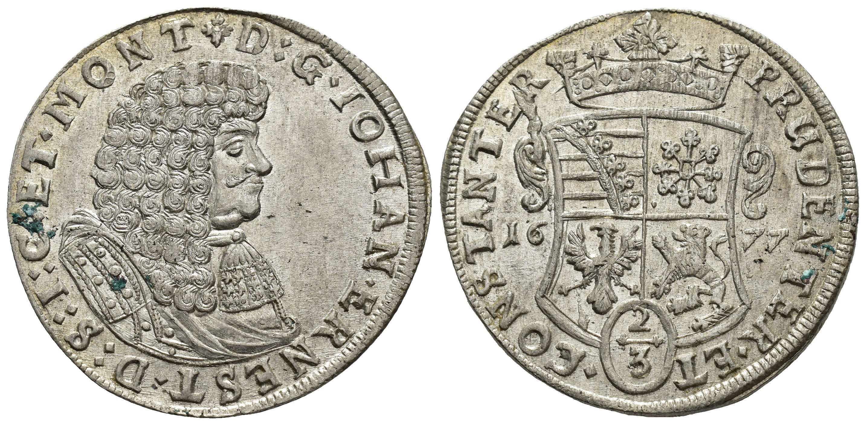 MONEDA EXTRANJERA. ALEMANIA Y ESTADOS ALEMANES. SAJONIA-NEU WEIMAR. Juan Ernesto. 2/3 tálero. 1677. AR 17,48 g. 37,8 mm. Dav.-892. Concreciones en anv. Pleno B.O. SC.
