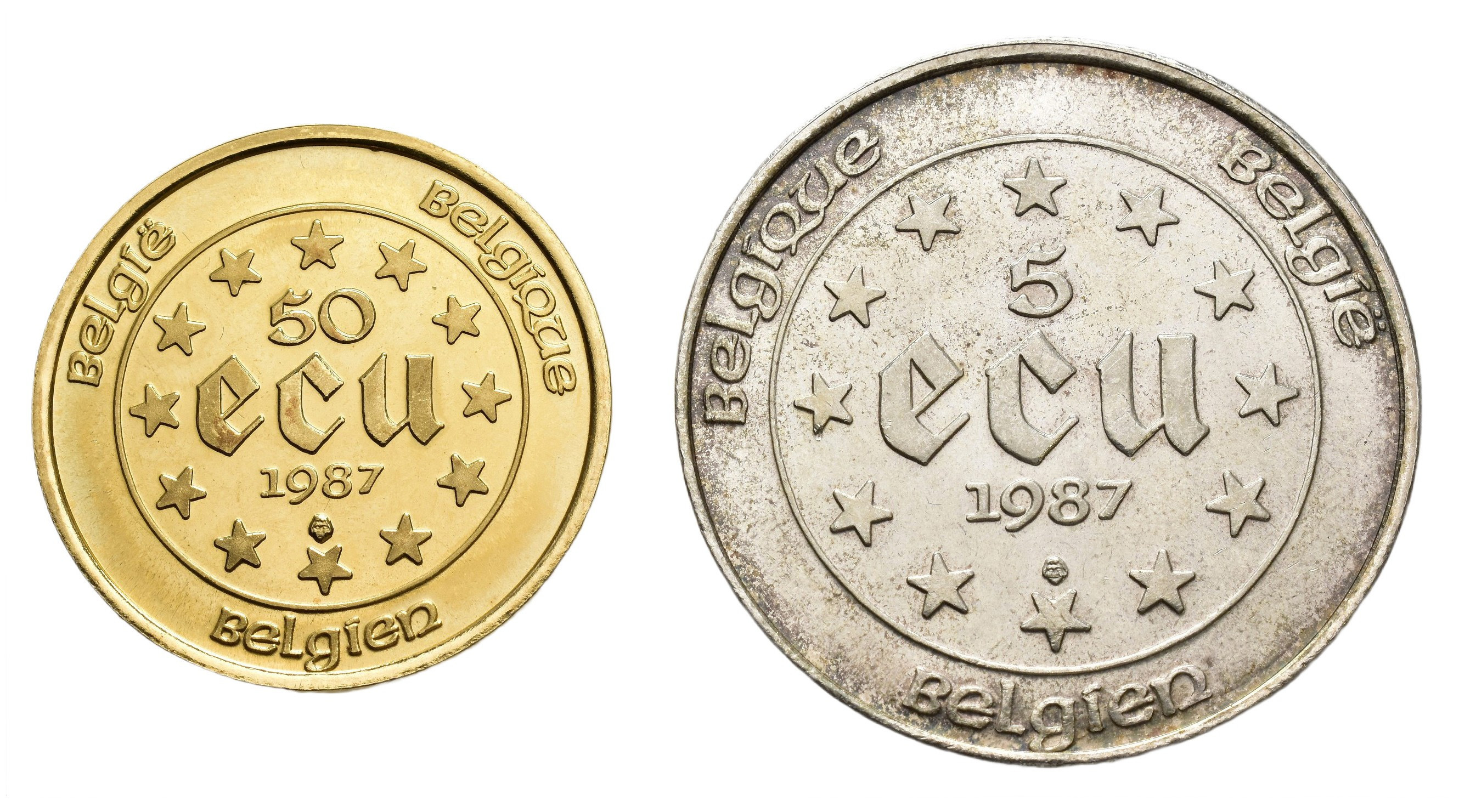 MONEDA EXTRANJERA. BÉLGICA. 1987. Estuche con 500 ecu (17,3 g. AU) y 5 ecu (AR). Prueba.