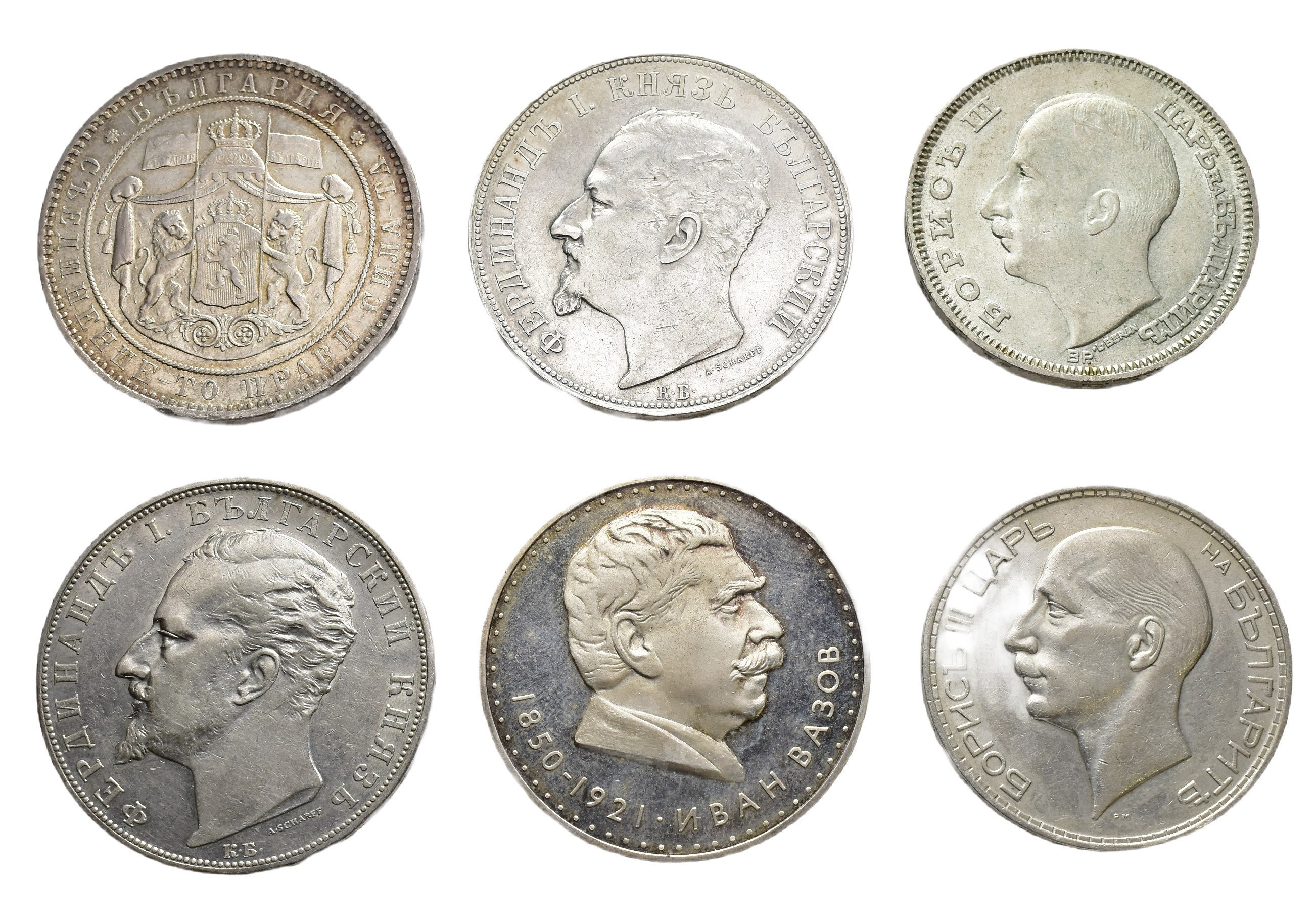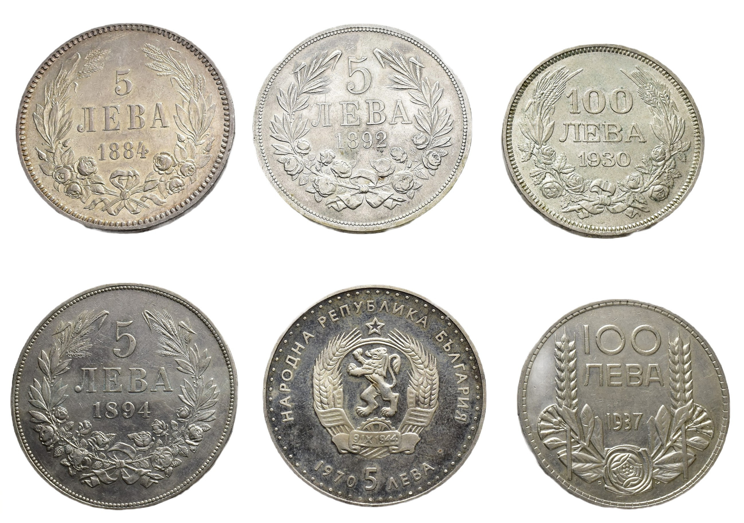 MONEDA EXTRANJERA. BULGARIA. Lote de 6 piezas: Alejandro I 5 leva 1884; Fernando I 5 leva 1892 y 1894; Boris III 100 leva 1930 y 1937; 5 leva 1970. MBC+/SC y Prueba.