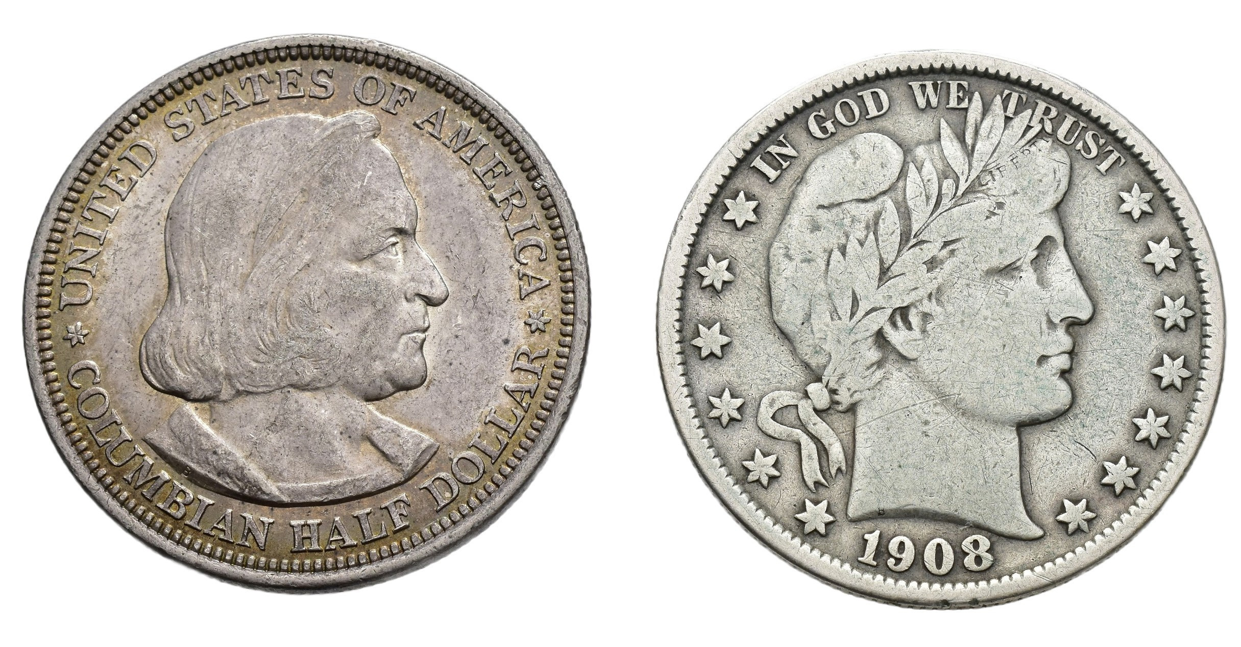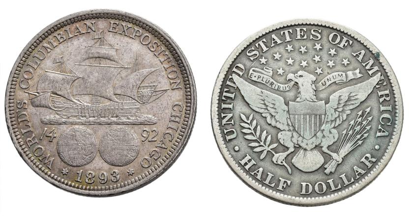 MONEDA EXTRANJERA. ESTADOS UNIDOS DE AMÉRICA. Lote de 2 piezas: 1/2 dólar 1893 Filadelfia, Exposición Universal de Chicago y 1908. BC+ y EBC-.