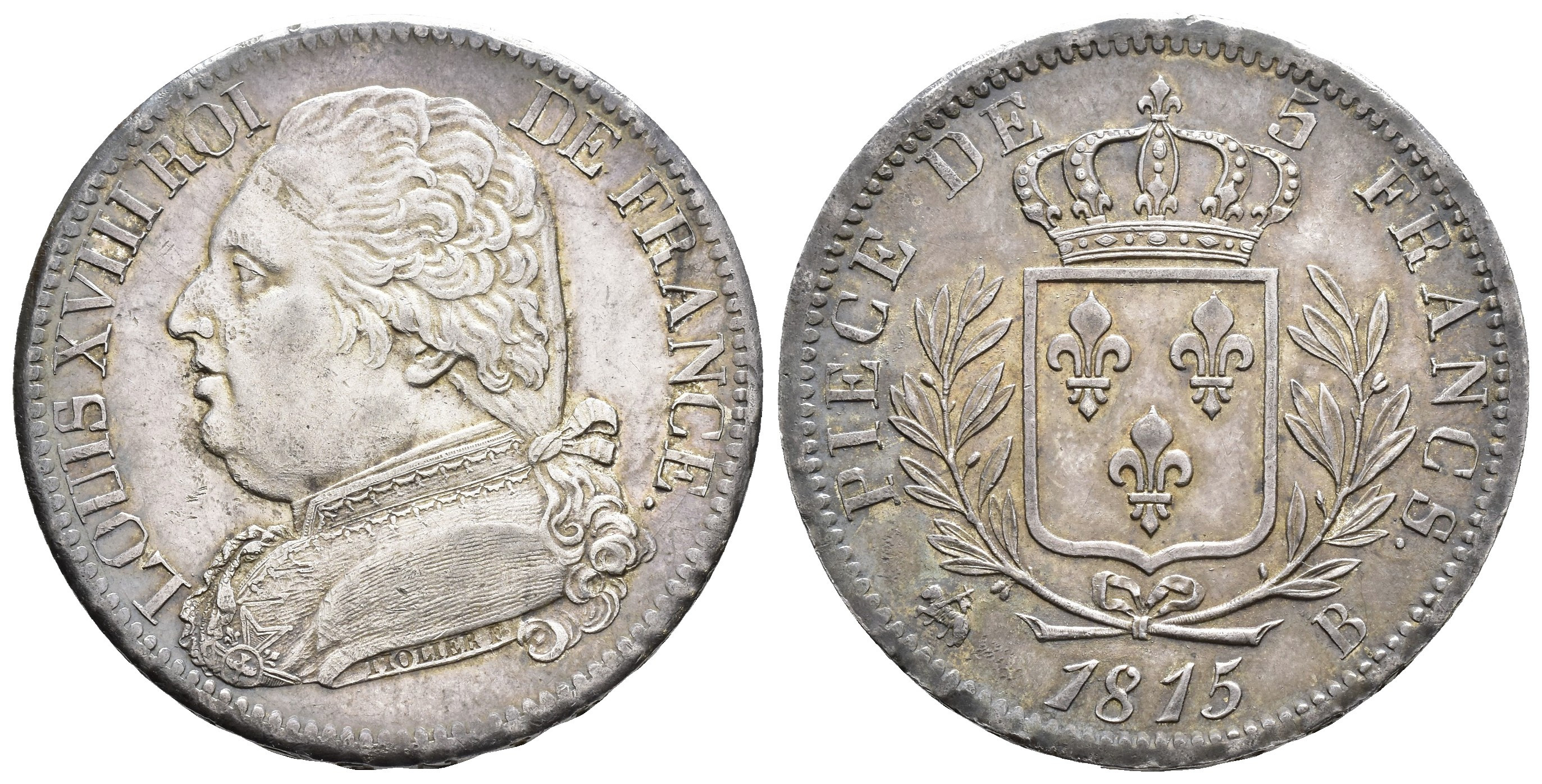 MONEDA EXTRANJERA. FRANCIA. Luis XVIII. 5 francos. 1815. Rouen. B. AR 24,93 g. 37,3 mm. KM-702.1. Pequeñas marcas. Cuño oxidado en anv. EBC.